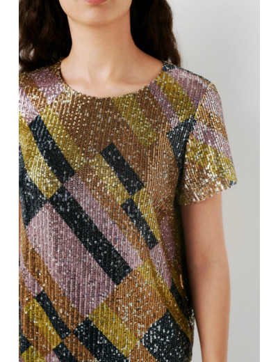 Tissu principal : 95 % polyester, 5 % élasthanne. Doublure : 100 % polyester. Longueur 60 cm pour une taille 38. Lavage à la main recommandé pour préserver l’éclat des sequins et la qualité du tissu.