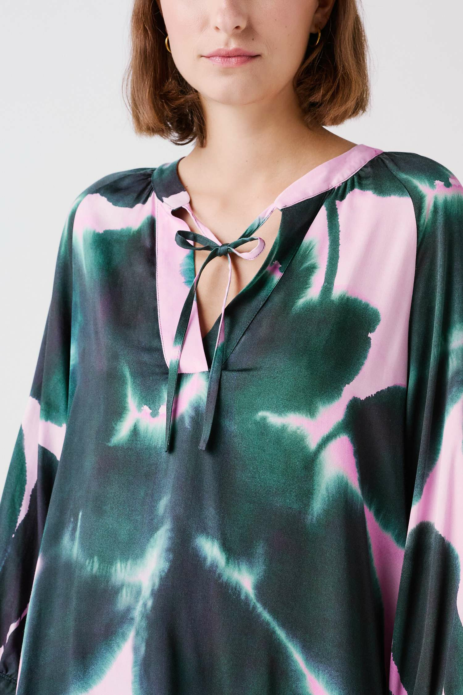 Tissu principal 100 % viscose, longueur 67 cm en taille 38, col tunisien avec deux cordons, manches longues. Lavage conseillé à 30°C avec action réduite pour préserver la qualité du tissu et des couleurs.
