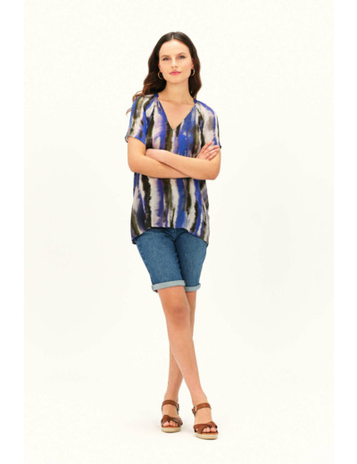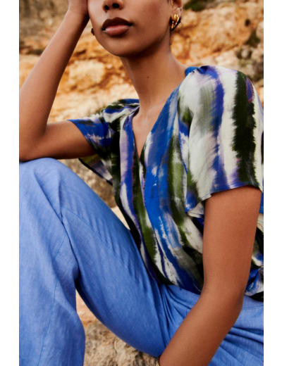 Tissu principal : 100 % viscose. Col V. Manches courtes. Longueur 65 cm (taille 38). Lavage à 30°C, action réduite.