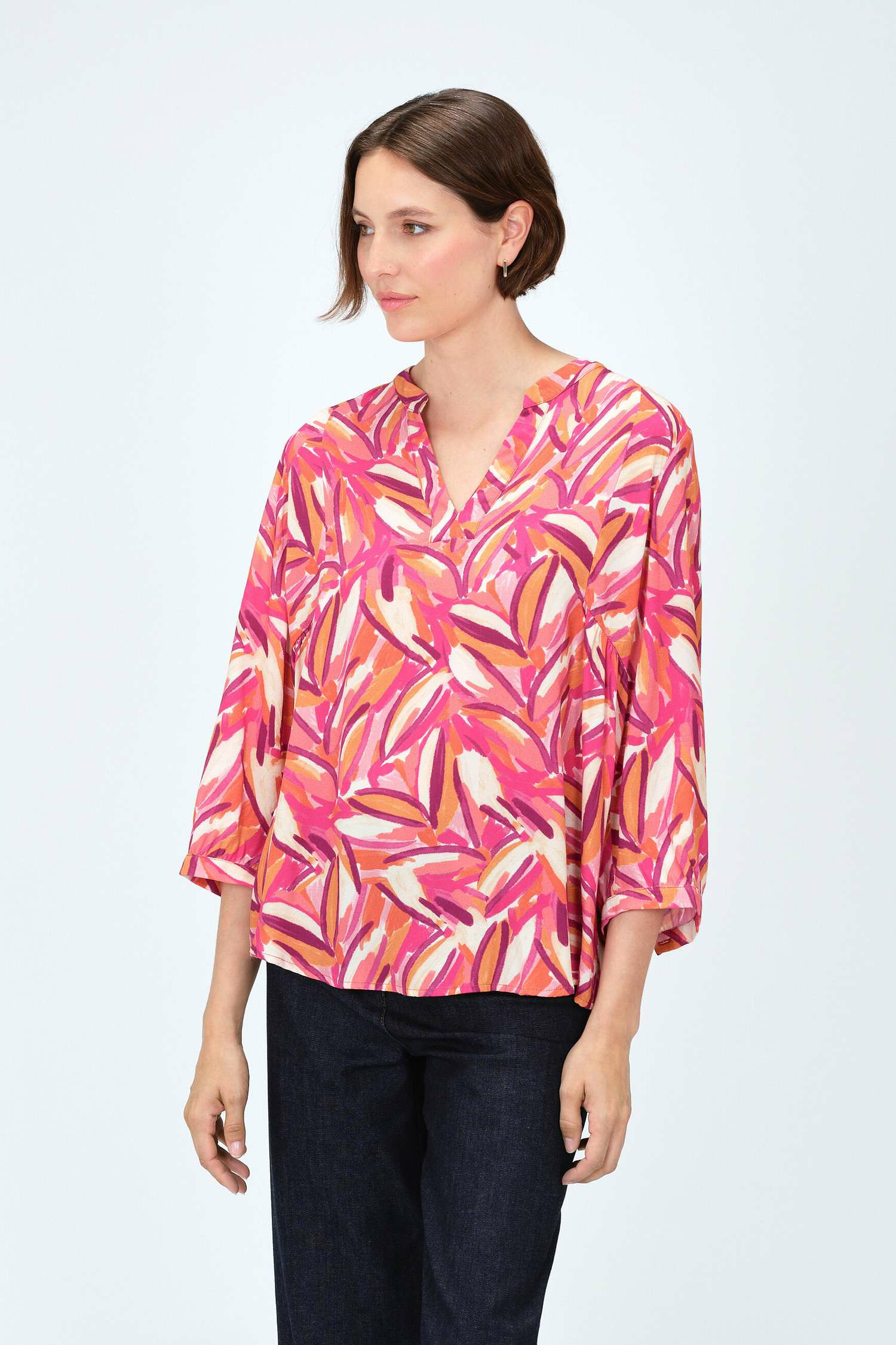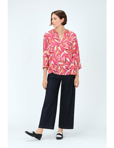 Tissu principal : viscose 100%. Coupe droite. Col tunisien. Manches 7/8 bouffantes. Lavage à 30°C, action réduite.