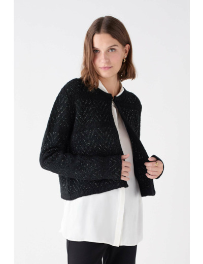 Conçu dans une maille fantaisie raffinée, ce bolero à la coupe droite offre une silhouette structurée et moderne. Son col rond fermé par un bouton souligne la simplicité sophistiquée du modèle, tandis que ses manches longues apportent confort et chaleur légère. Polyvalent, il s’associe aussi bien à une jupe fluide, un pantalon chic ou une robe élégante, pour un style sans effort en toutes occasions.