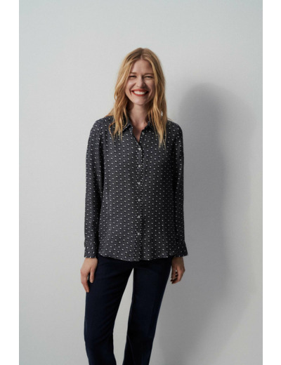 La chemise Brenda1 présente une fermeture par boutonnière sur patte, un col chemise traditionnel, des manches longues et une longueur totale de 67 cm en taille 38. Son tissu principal est composé à 100% de viscose, garantissant douceur et fluidité.