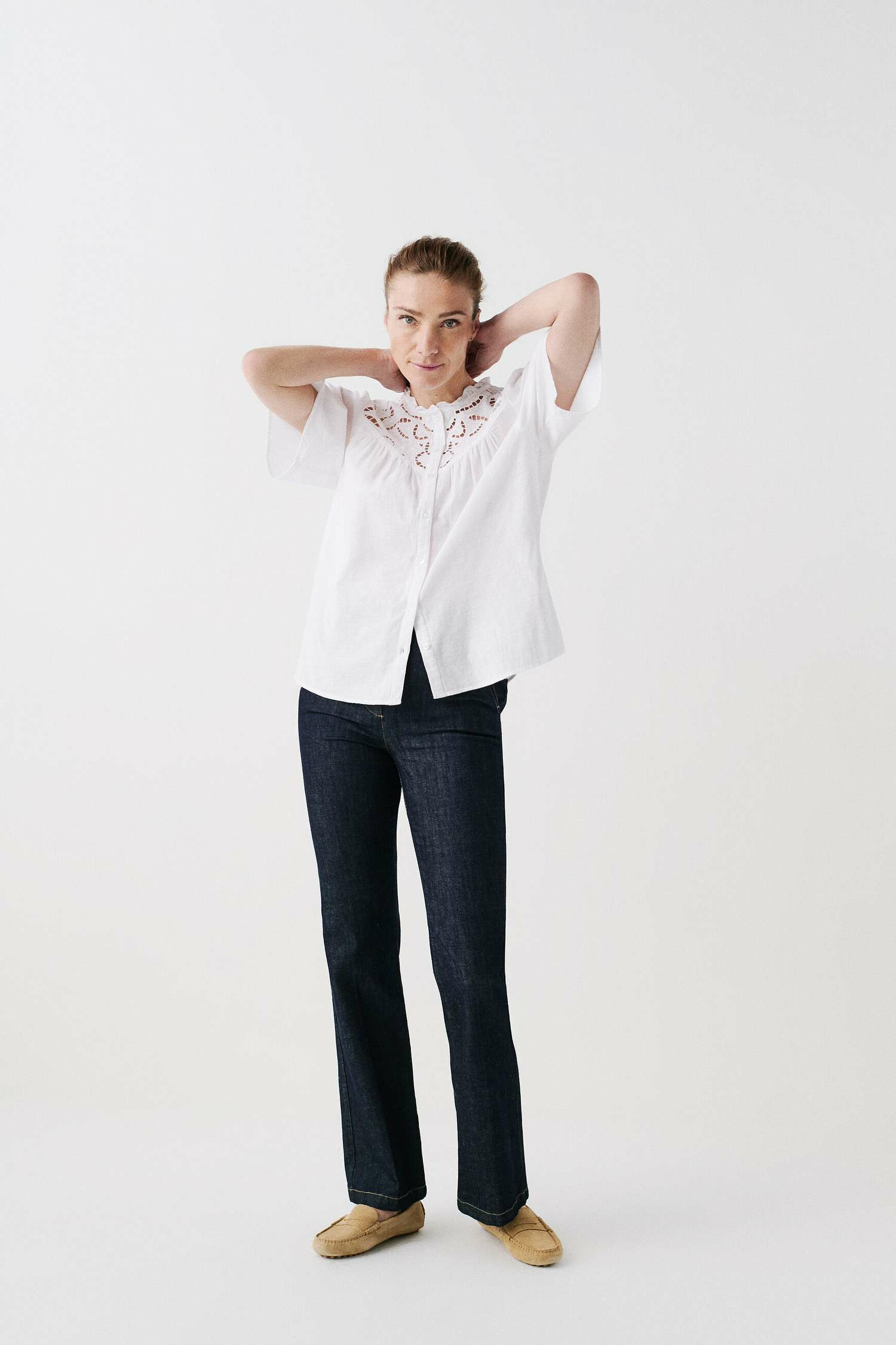 Confectionnée en coton 100 %, cette chemise légère se distingue par son col rond orné de fronces et ses manches courtes parfaitement ajustées. Les broderies ajourées sur le décolleté apportent une touche raffinée et féminine, tandis que les plis sous la poitrine structurent subtilement la coupe. Avec une longueur de 65 cm pour une taille 38, elle s’adapte aisément à toutes vos tenues, du casual chic au bureau.
