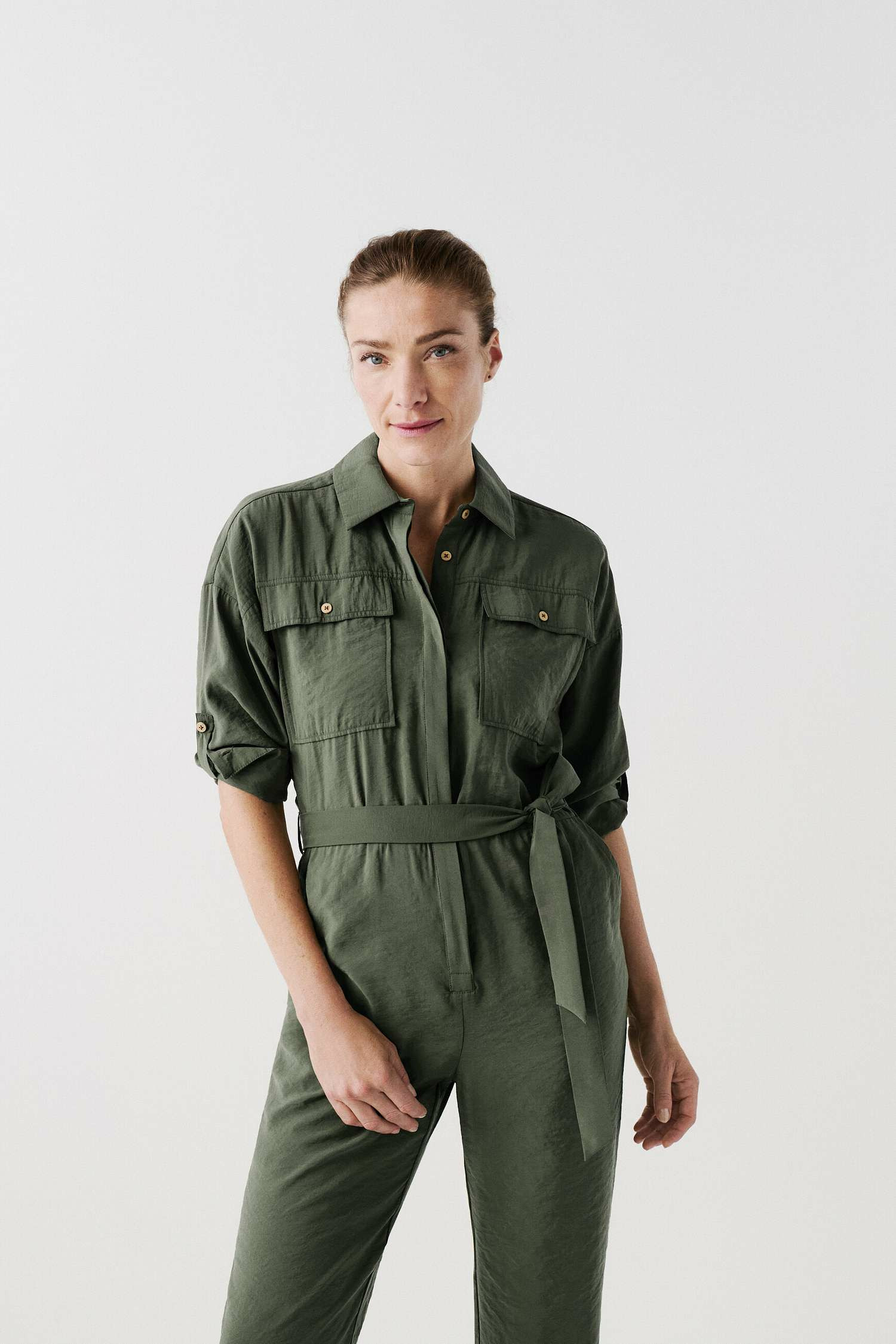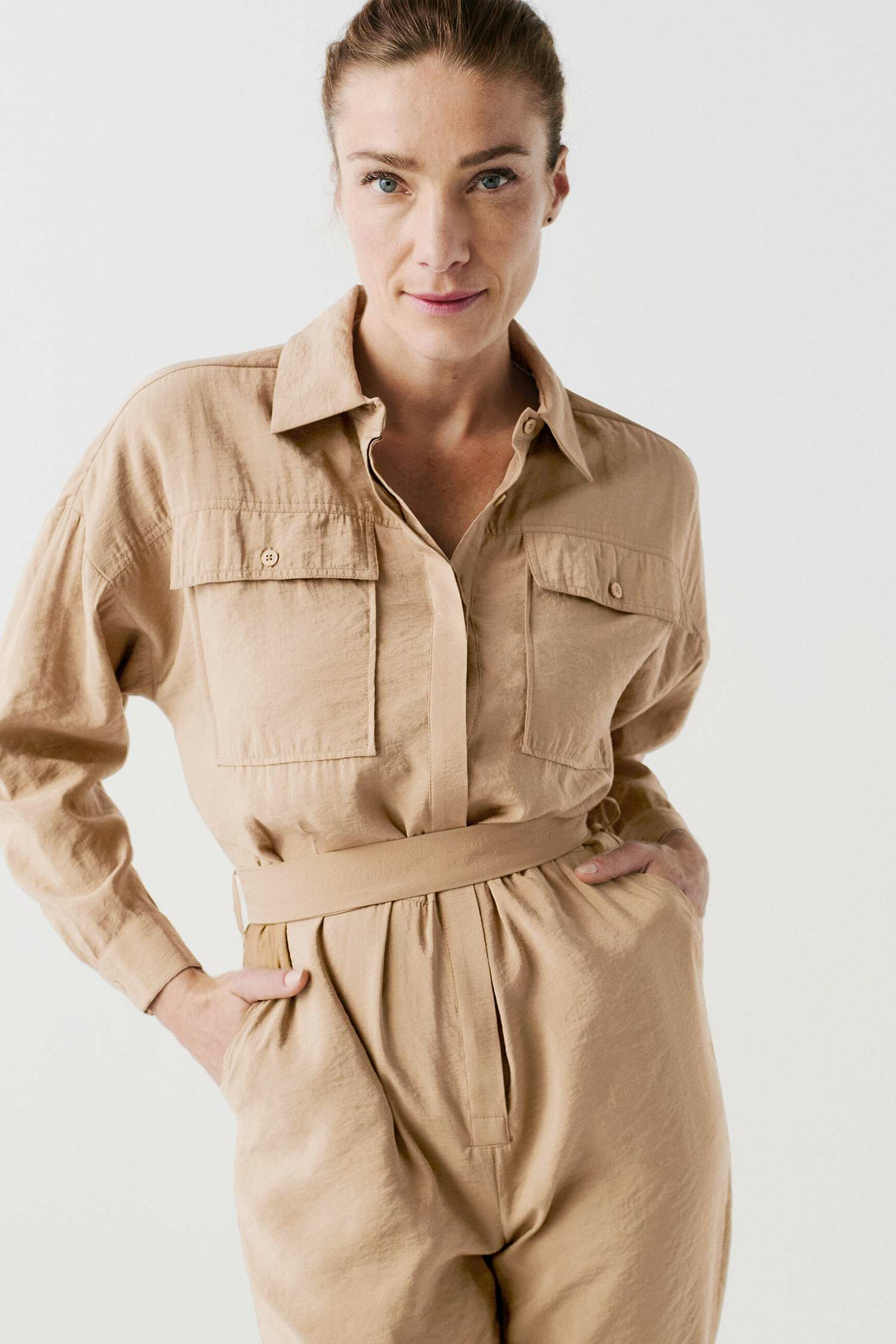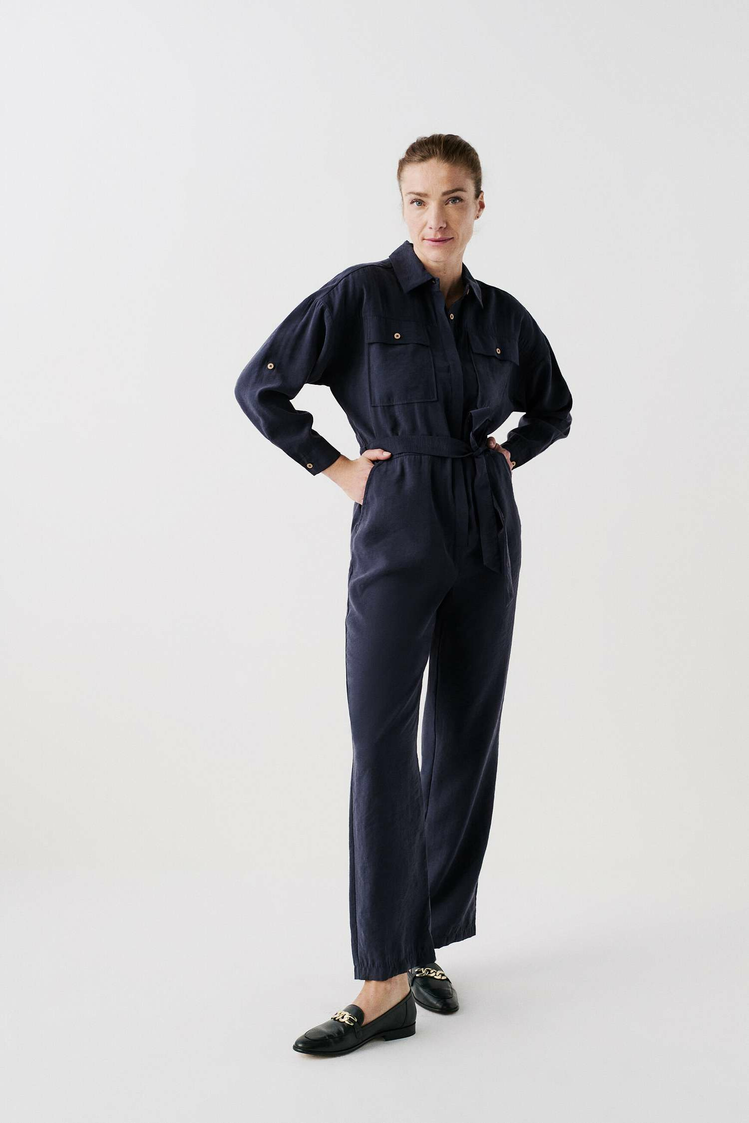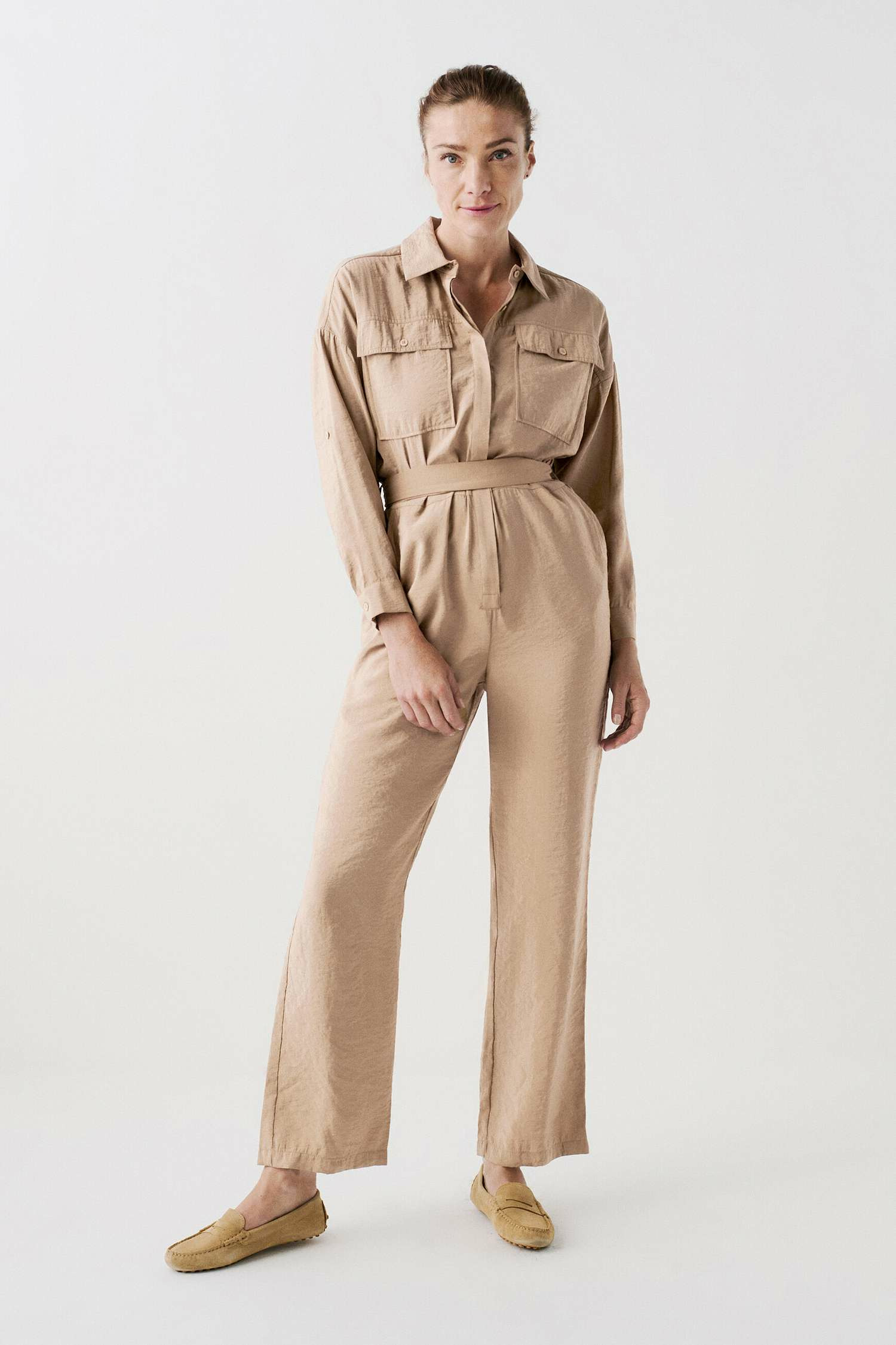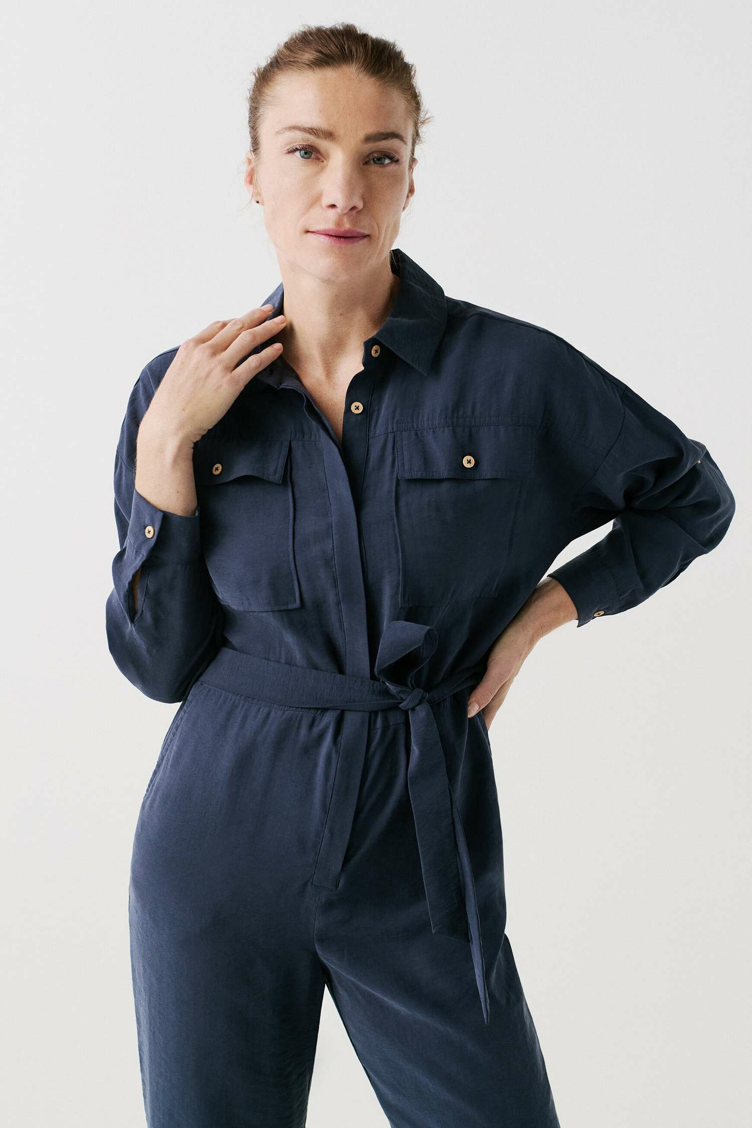 Tissu principal : 86% modal, 14% polyester. Coupe large, col chemise, manches longues, poches poitrine à rabat avec boutons métallisés. Ceinture à nouer à la taille, fermeture sous patte. Longueur entrejambe : 76 cm (taille 38). Lavage à 30°C, action réduite.