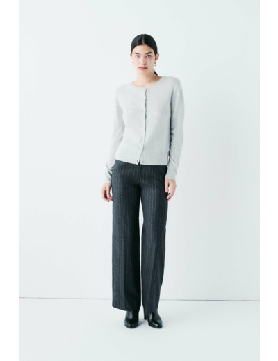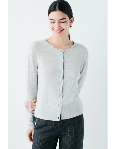 Tissu principal : 100 % cachemire. Boutons et accessoires en nacre. Col rond, manches longues, fermeture par boutonnière. Longueur 55 cm en taille S. Lavage à la main recommandé pour préserver la qualité du cachemire.