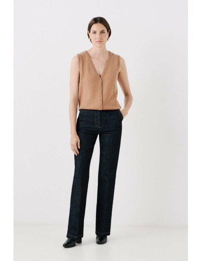 Confectionné dans un mélange luxueux de laine RWS et cachemire, ce gilet sans manches se distingue par ses finitions soignées et ses bords-côtes délicats. Sa teinte unie s’adapte aisément à votre garde-robe, tandis que la fermeture par boutonnière en nacre ajoute une touche de sophistication discrète.
