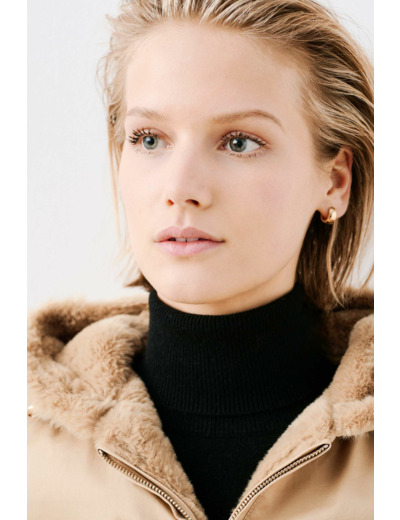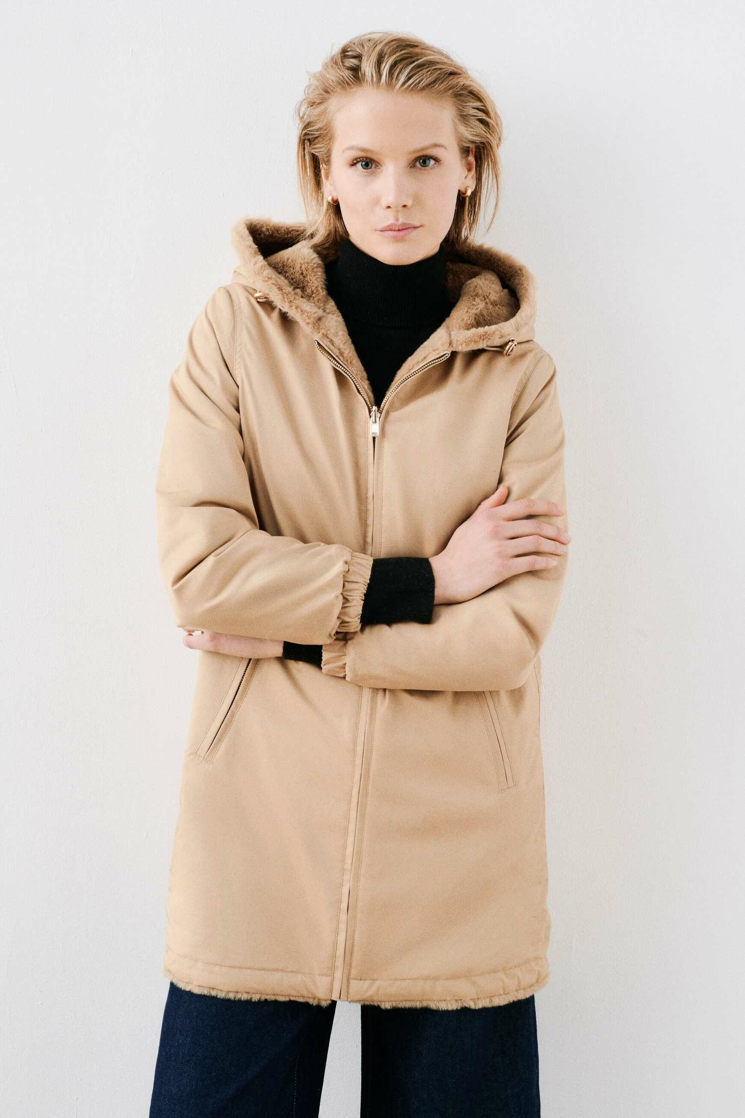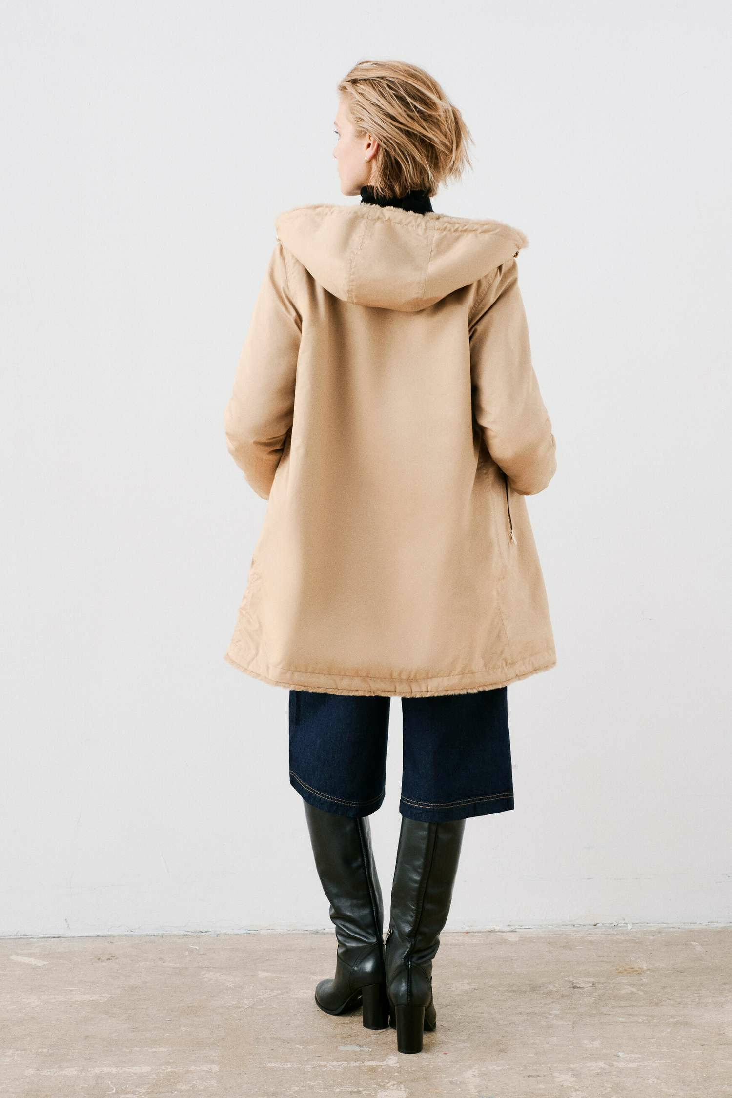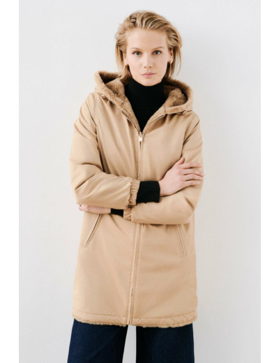 Tissu principal 100 % coton pour une douceur naturelle. Imitation fourrure 100 % polyester pour un confort supplémentaire. Longueur 85 cm (taille 38). Fermeture par zip. Modèle réversible avec capuche, manches longues et quatre poches. Traitement déperlant. Entretien : pas de lavage.