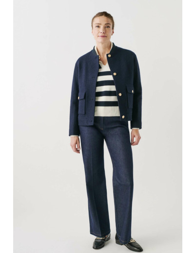 Tissu principal : 100 % laine vierge. Doublure : 100 % acétate. Col rond, manches longues, poches plaquées à rabat. Fermeture par boutonnière dorée. Longueur 61 cm (taille 38). Entretien : ne pas laver.