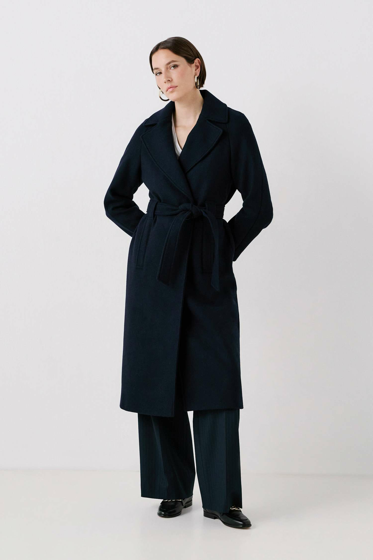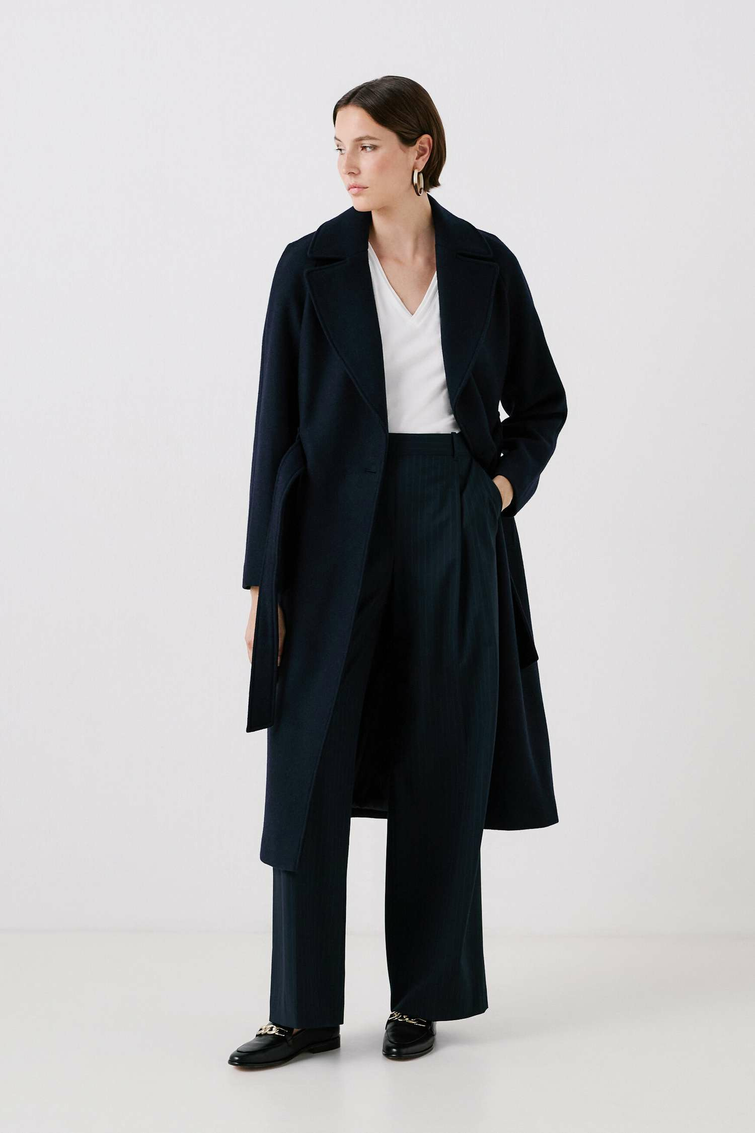 Tissu principal : 59% laine, 27% polyester, 7% autres fibres, 7% acrylique. Doublure : 100% polyester. Longueur : 115 cm (taille 38). Fermeture par ceinture à nouer. Entretien : nettoyage à sec recommandé, pas de lavage.