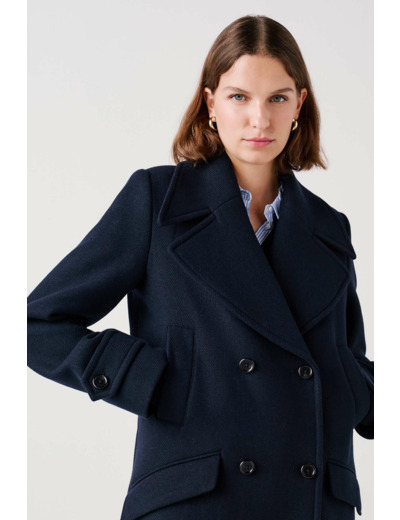 Tissu principal composé de 50% laine, 40% polyester et 10% polyamide, doublure 100% polyester. Longueur 110 cm pour une taille 38. Coupe droite, col tailleur, manches longues, fermeture boutonnée. Doublure intégrale pour un confort optimal.