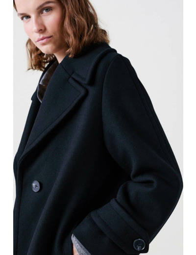 Tissu principal : 78% laine, 22% polyamide. Doublure : 100% polyester. Longueur 110 cm pour une taille 38. Entretien : ne pas laver.