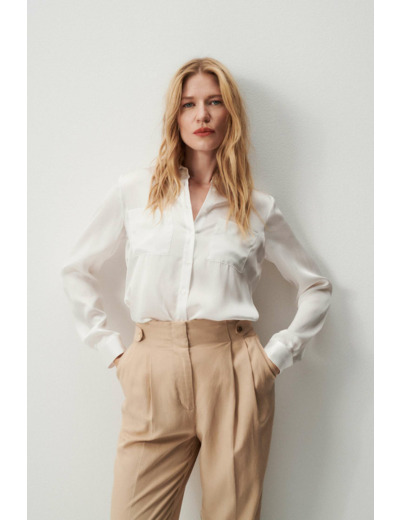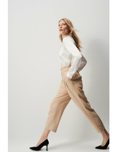 Confectionné en lyocell, une fibre naturelle et écologique, ce pantalon offre une sensation de légèreté et de fraîcheur tout au long de la journée. Sa texture respirante et fluide épouse parfaitement les formes, tandis que le pli marqué souligne la jambe pour une allure affinée et structurée. Les pattes boutonnées décoratives et la taille élastiquée au dos apportent une touche raffinée et un confort optimal.