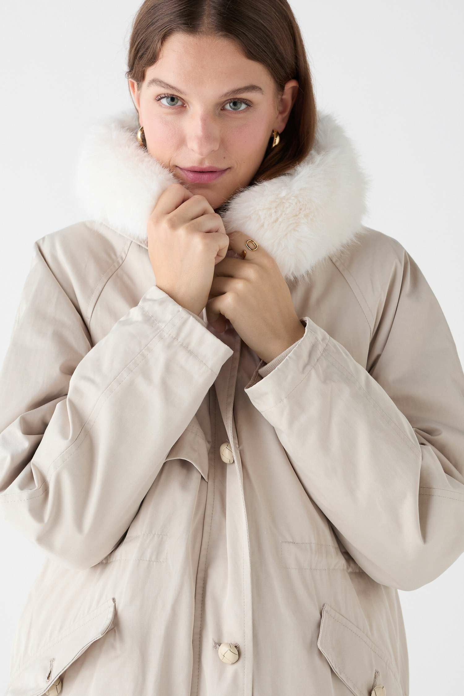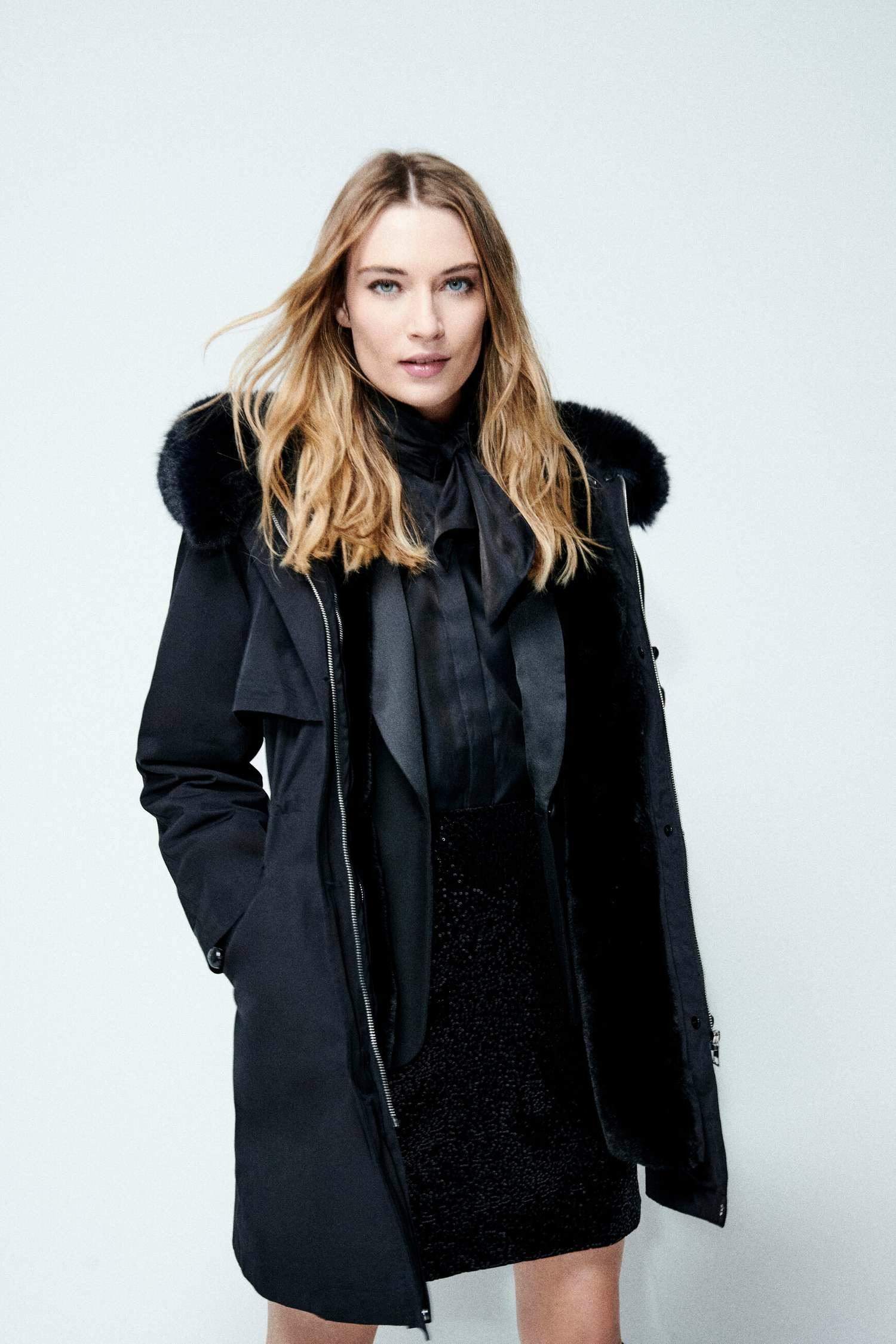 Parka longue à coupe droite, fermeture zip et boutons ton sur ton, manches longues, lien ajustable sous tunnel pour cintrer la taille, poches à rabat, capuche fixe, col imitation fourrure amovible, doublure intérieure amovible 100% polyester, longueur 87 cm en taille 38. Tissu principal 62% polyester, 38% coton. Doublure, rembourrage et imitation fourrure 100% polyester. Modèle déperlant. Entretien : pas de lavage.