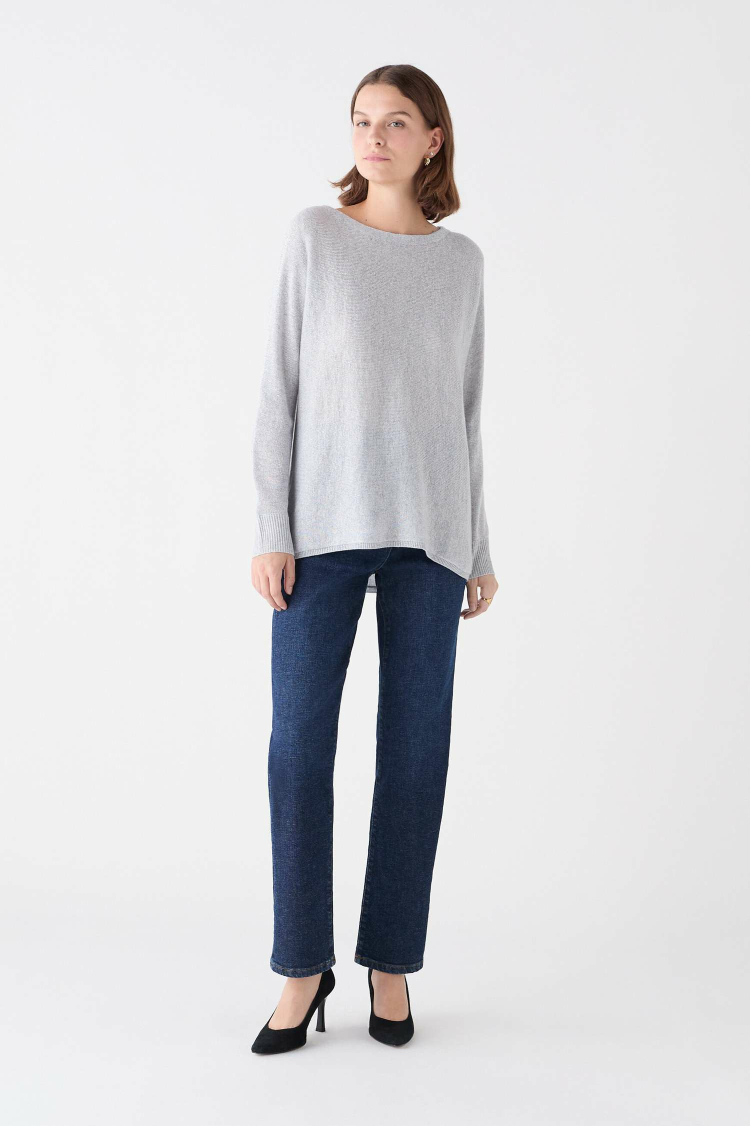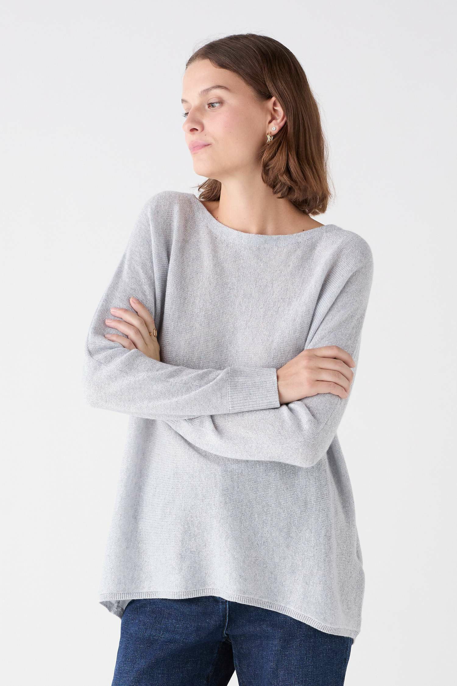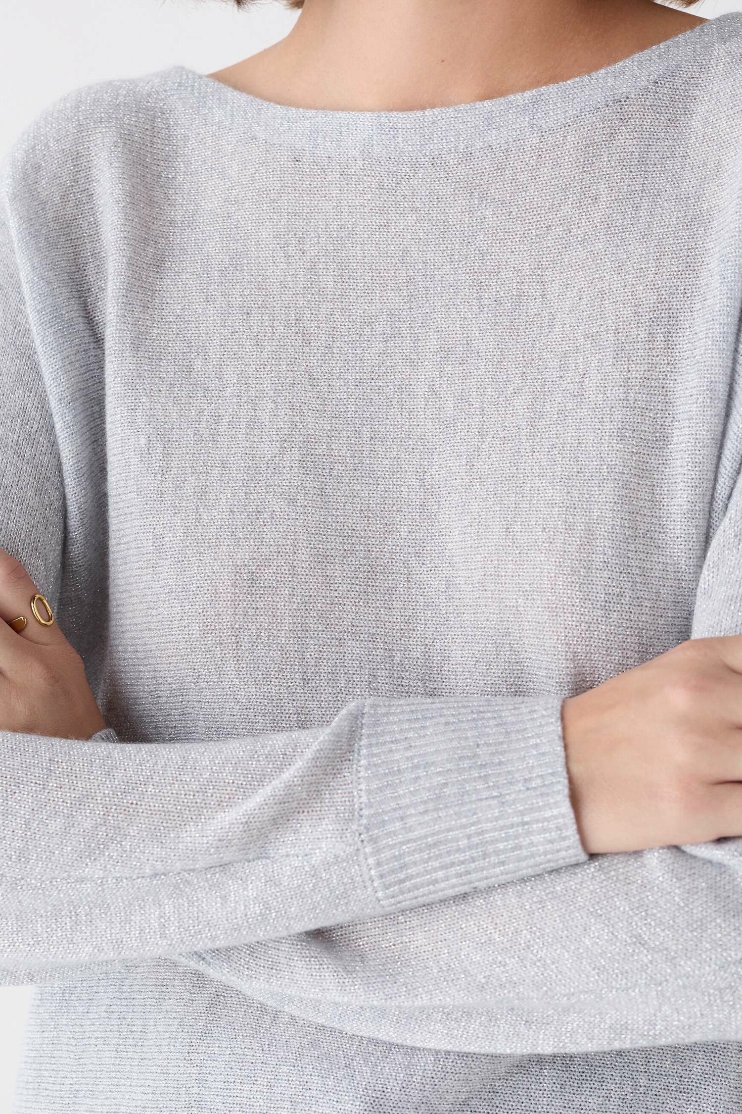 Pull oversize col bateau, manches longues, longueur 58,5 cm en taille S. Composition : 85 % cachemire, 10 % polyester, 5 % fil métallisé. Lavage à la main recommandé, repassage à basse température sans vapeur. Nettoyage à sec et sèche-linge interdits.