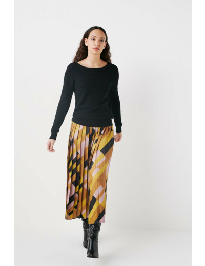 Confectionné dans un mélange de viscose, polyamide et fil métallisé, ce pull allie douceur et légèreté pour un confort optimal tout au long de la journée. Son col bateau et ses manches longues soulignent une silhouette raffinée tandis que les finitions bords-côtes apportent une touche soignée et durable.