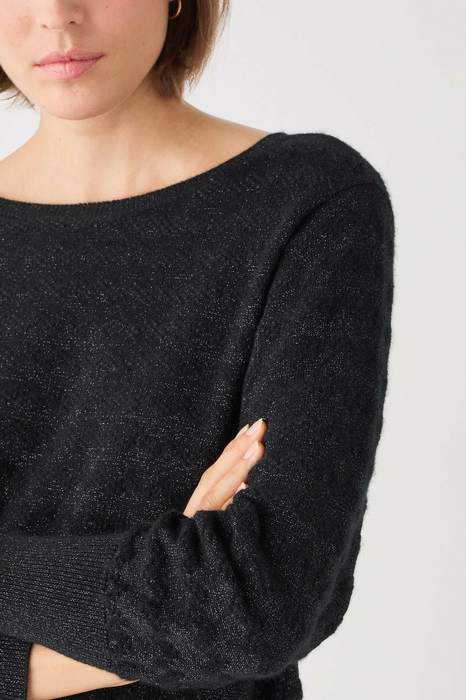 Tissu principal : 85% cachemire, 10% polyamide, 5% fil métallisé. Coupe droite, col bateau, manches 3/4, longueur 59,5 cm en taille S. Lavage à la main recommandé pour préserver la qualité du cachemire.