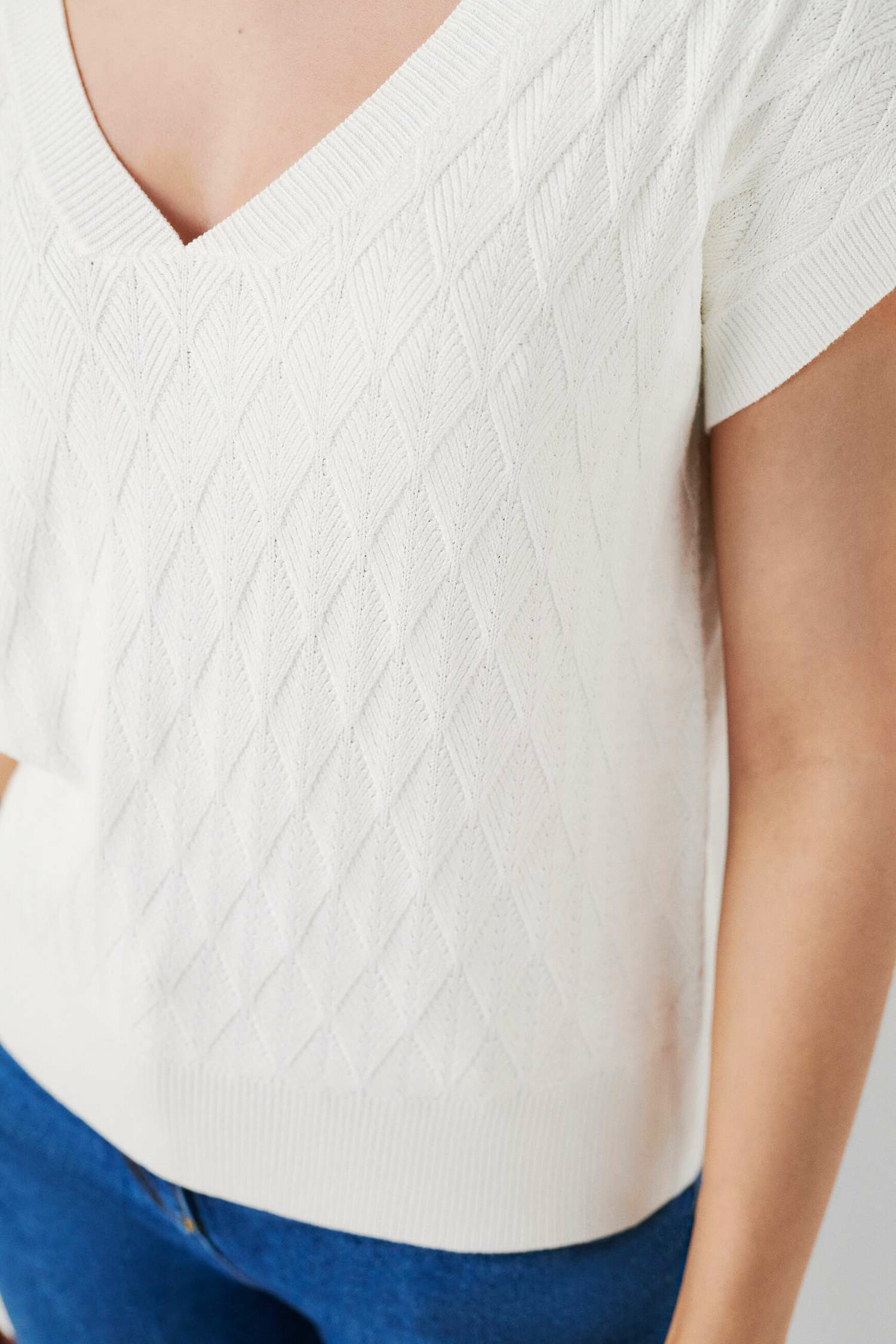 Tissu principal : 92% viscose, 8% polyester. Col V, manches courtes, mailles fantaisie. Longueur 55 cm (taille S). Finitions bords-côtes. Lavage à la main recommandé pour préserver la qualité du tissu.