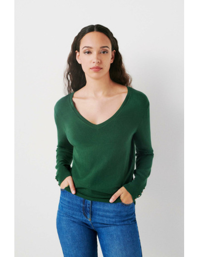 Réponse : Il se distingue par son col V, ses boutons dorés décoratifs aux poignets et ses finitions en bords-côtes.