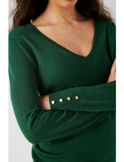 Confectionné dans un mélange raffiné de viscose et polyamide, ce pull offre une sensation de douceur incomparable au contact de la peau. Son col V délicat et ses manches longues apportent une touche de sophistication, tandis que les boutons dorés décoratifs aux poignets ajoutent un détail subtil et chic. Avec ses finitions en bords-côtes, il assure une tenue impeccable tout au long de la journée.