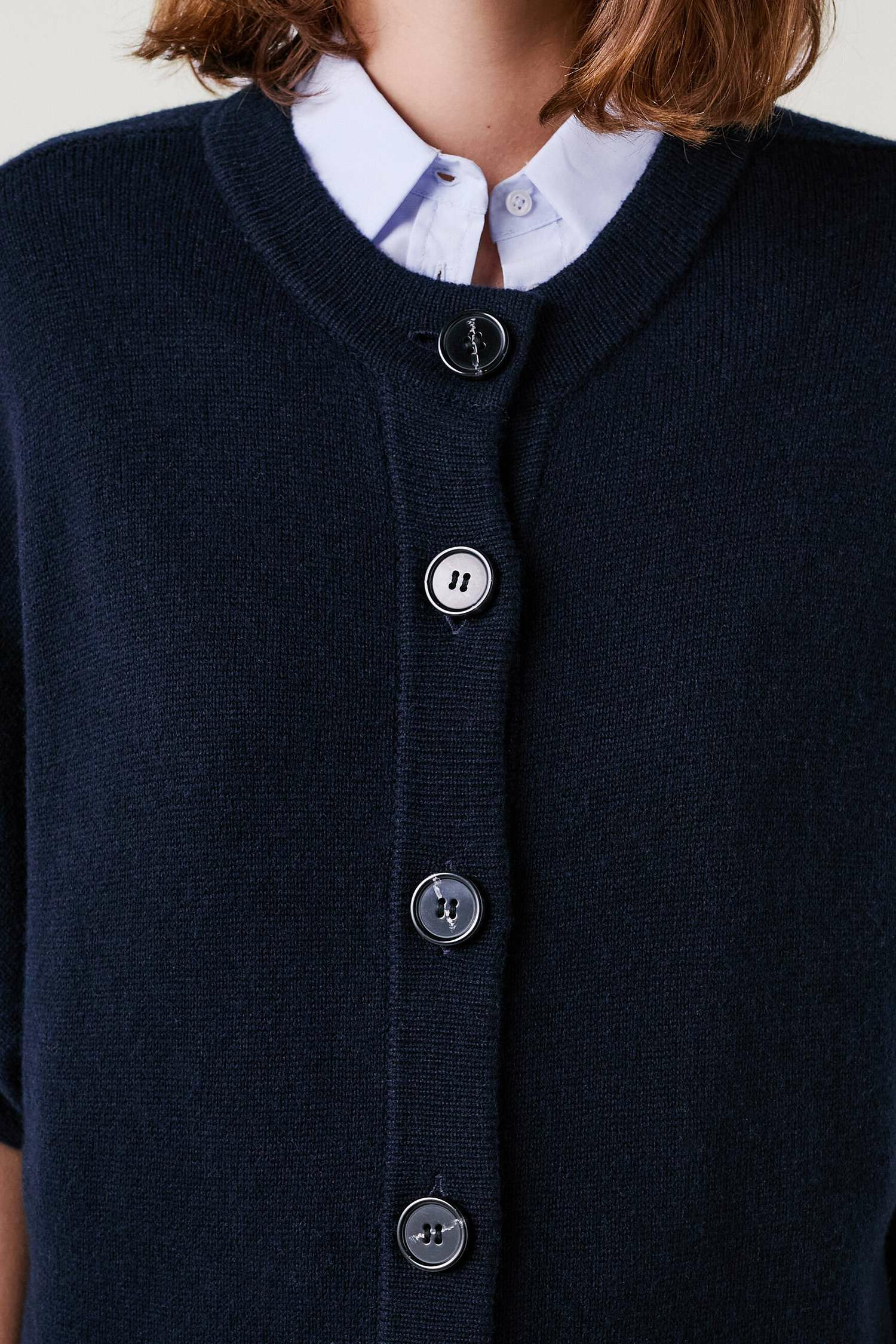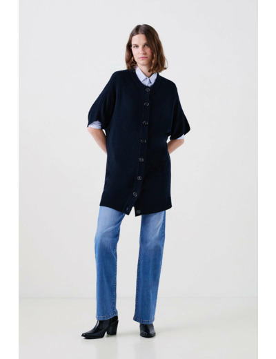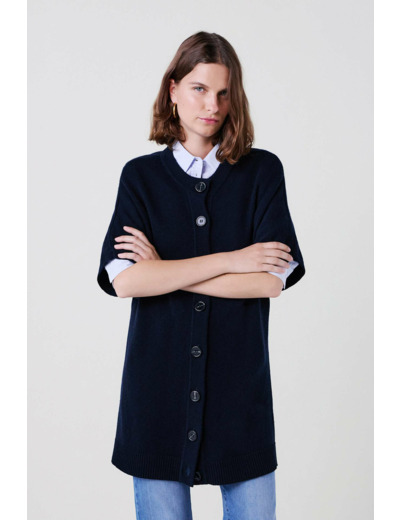 Tissu principal : laine RWS 50%, viscose 35%, polyamide 10%, cachemire 5%. Coupe droite mi-longue, longueur 75 cm en taille S. Col rond, manches 3/4, fermeture par boutonnière, finitions bords-côtes. Lavage à la main recommandé pour préserver la qualité des fibres.