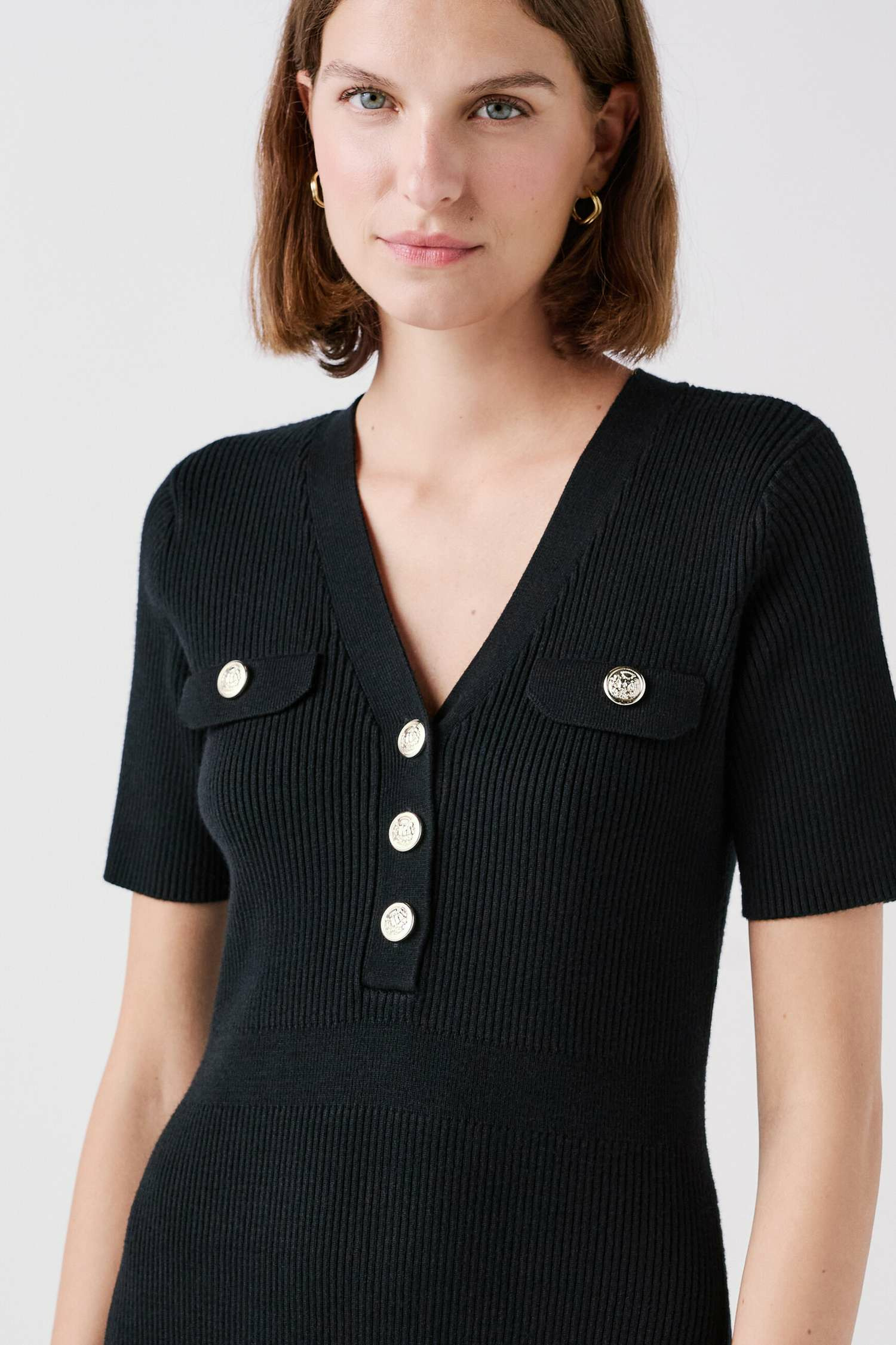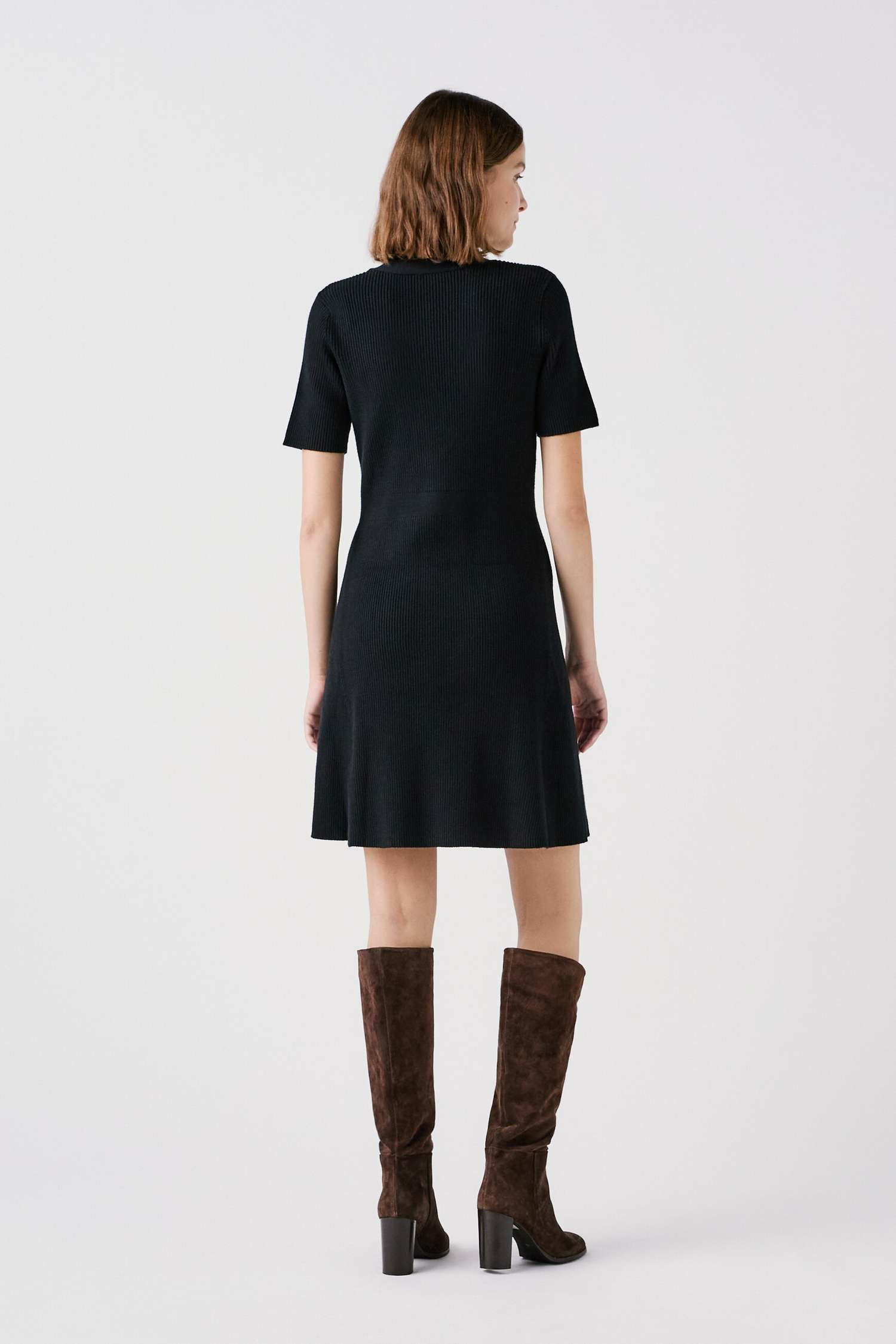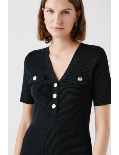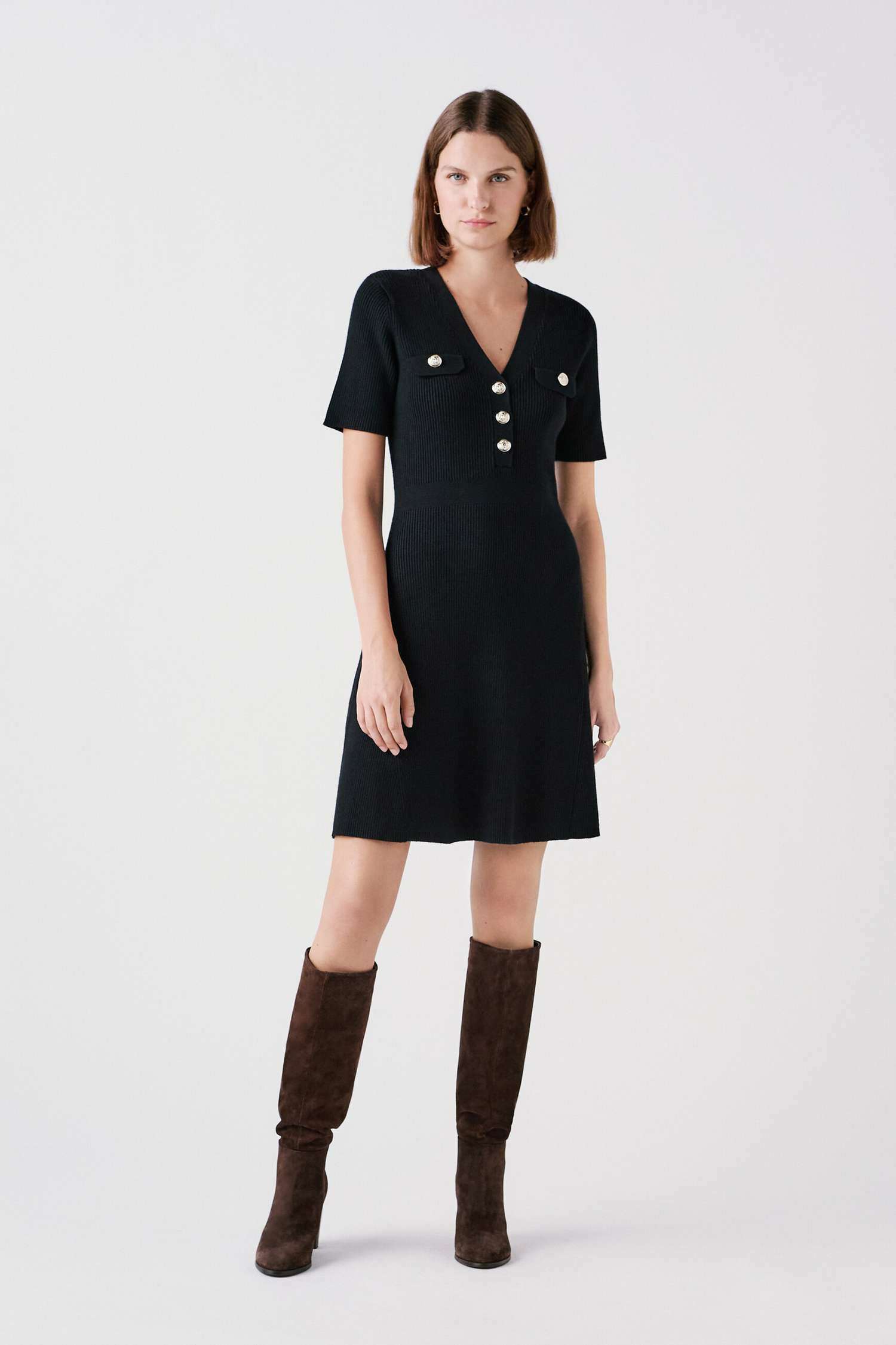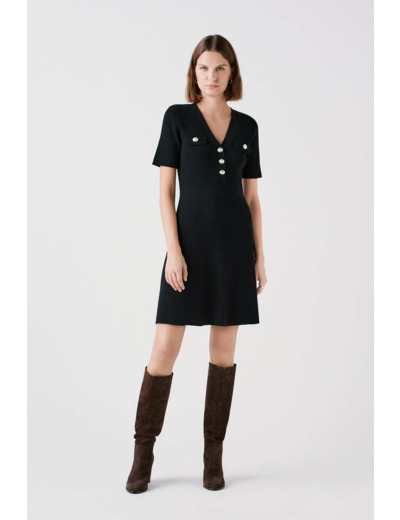 Réponse. La robe est courte avec un col en V et des manches courtes, offrant une silhouette moderne et élégante.