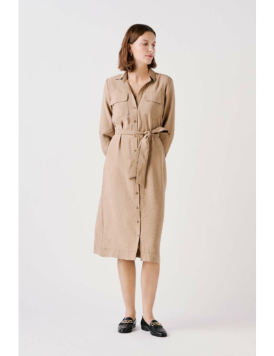 Conçue pour accompagner toutes vos journées, cette robe unie se distingue par son col polo raffiné et ses manches longues. Les poches à rabat sur la poitrine ajoutent une touche pratique et esthétique, tandis que la ceinture à nouer souligne délicatement la taille. La fermeture boutonnée facilite l’enfilage et apporte une finition soignée. Sa longueur de 114 cm pour une taille 38 assure une allure féminine et moderne.