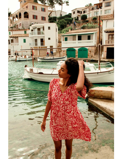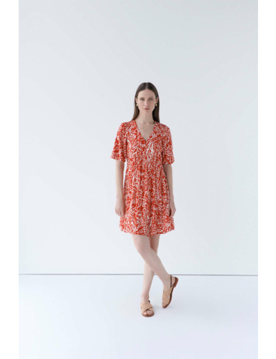Tissu principal et doublure 100 % viscose. Longueur de 94 cm pour une taille S. Col en V, manches courtes, coupe évasée. Lavage conseillé à 30°C avec action réduite pour préserver la douceur et la tenue du tissu.