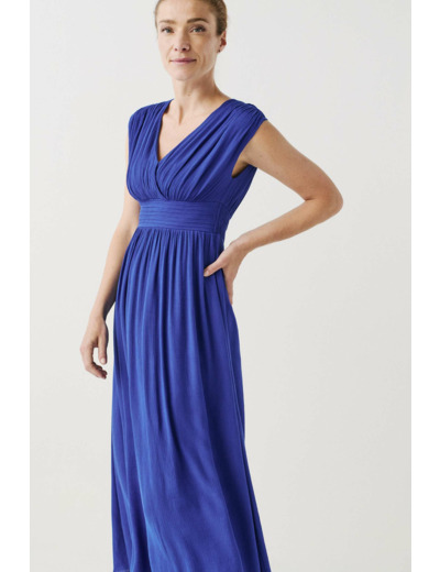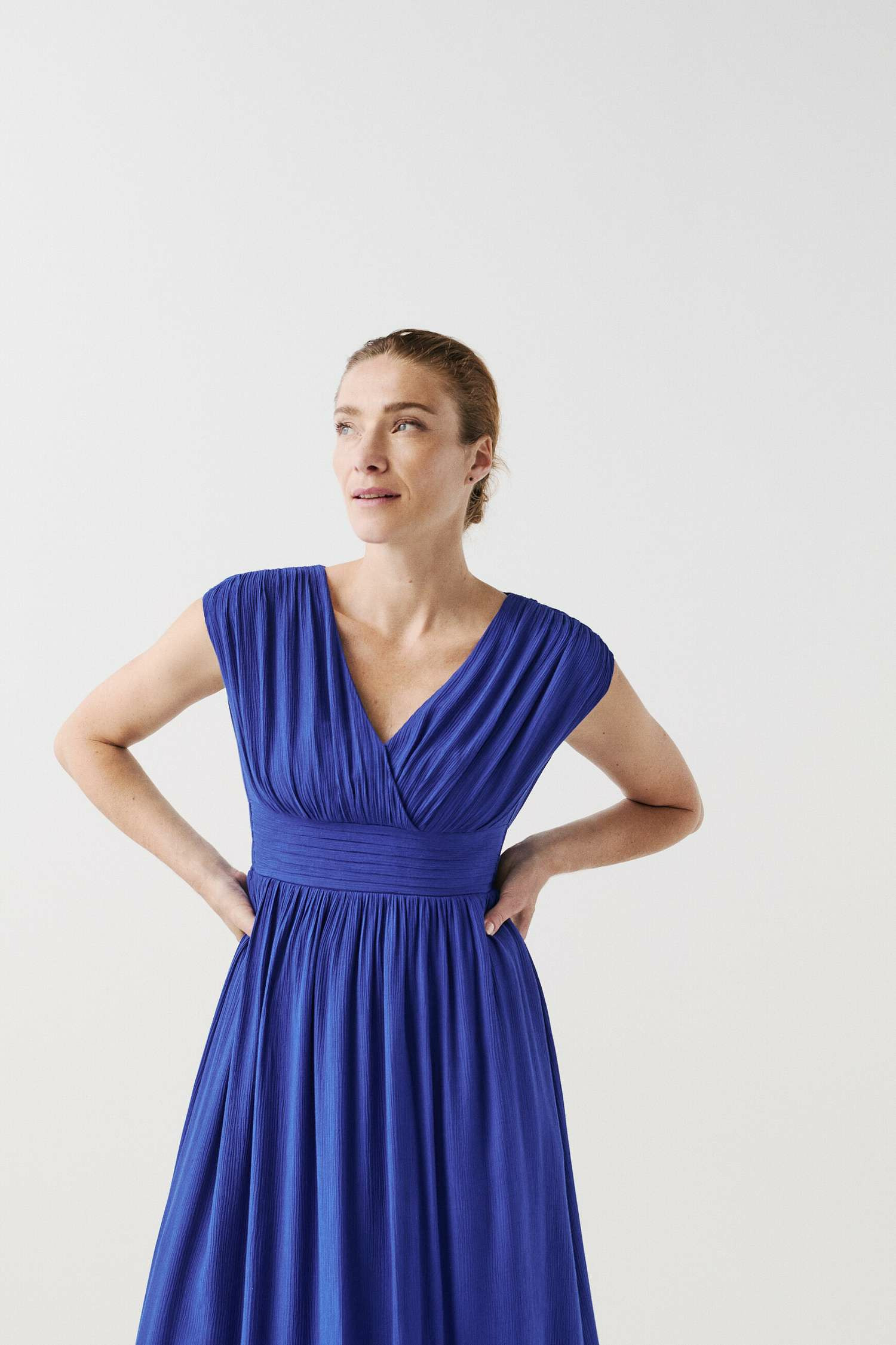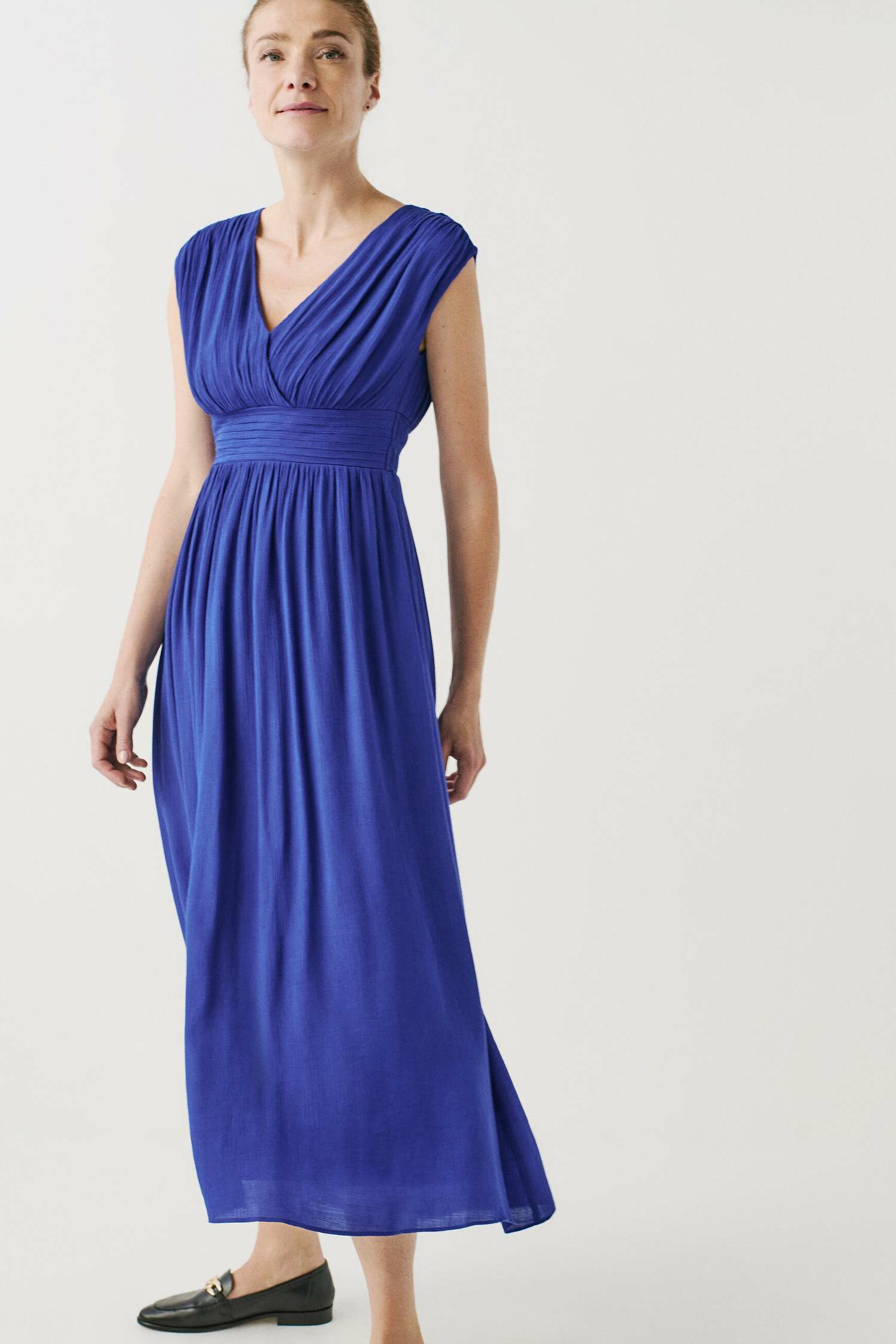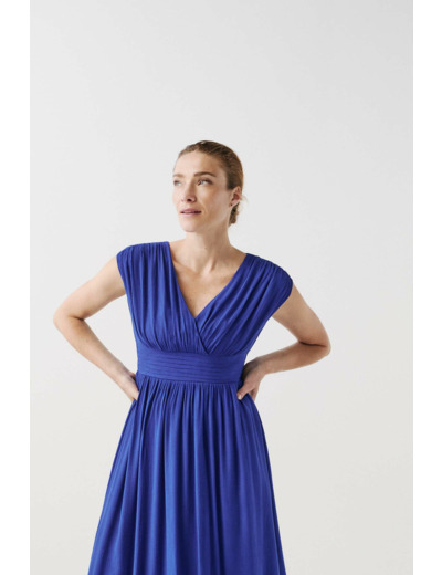 Conçue dans un mélange de viscose et polyamide, cette robe légère épouse le corps sans contrainte. Son col en V et son absence de manches offrent une allure aérienne, idéale pour les journées ensoleillées ou les soirées habillées. La taille est délicatement soulignée par un drapé qui crée un effet visuel raffiné et féminin.