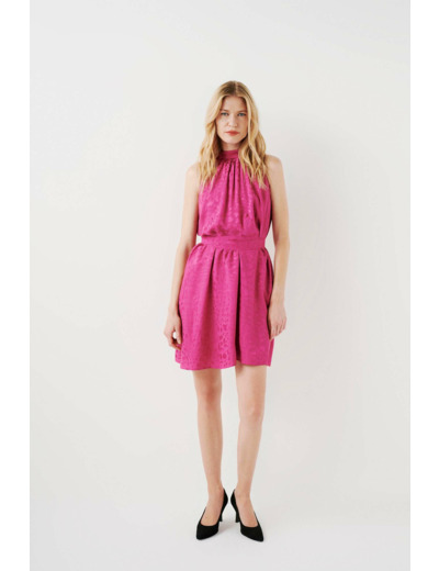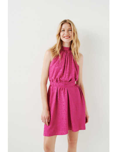 Tissu principal : 100% viscose. Doublure : 100% viscose. Coupe droite, sans manches, col montant, découpe froncée. Longueur 90 cm pour une taille 38. Lavage conseillé à 30°C avec action réduite pour préserver la matière.