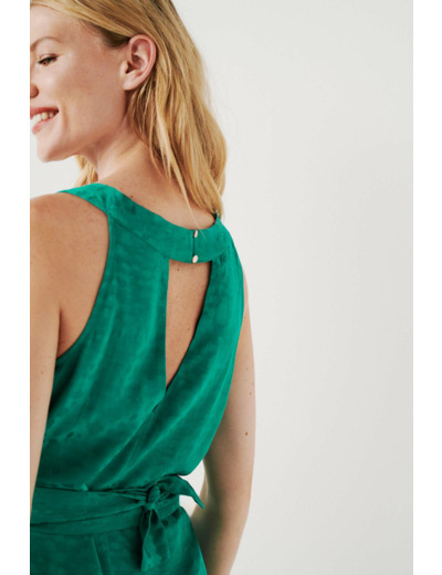 Tissu principal et doublure 100 % viscose. Col bénitier avec bouton à l’arrière. Sans manches. Ceinture à nouer à la taille. Dos ajouré. Longueur 90 cm pour une taille 38. Lavage recommandé à 30°C avec action réduite.