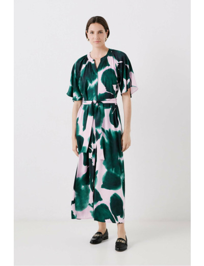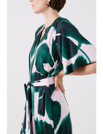 Tissu principal : 100 % viscose. Longueur 130 cm pour une taille 38. Col tunisien, manches longues, ceinture à nouer à la taille. Lavage à 30°C avec action réduite recommandé pour préserver la douceur et la tenue du tissu.