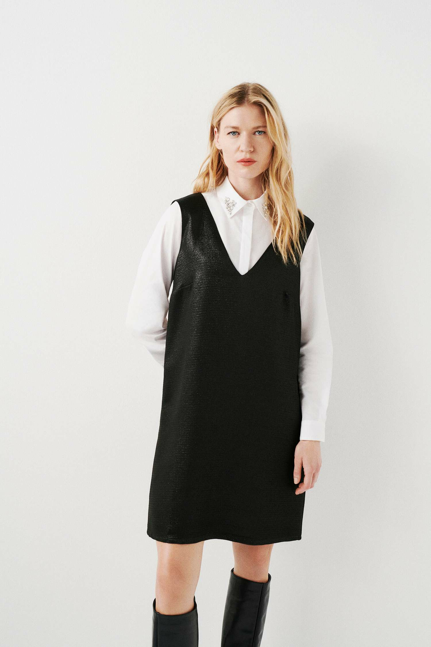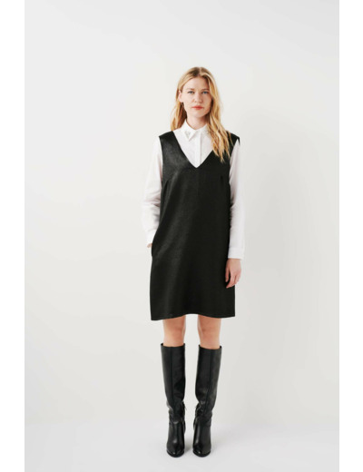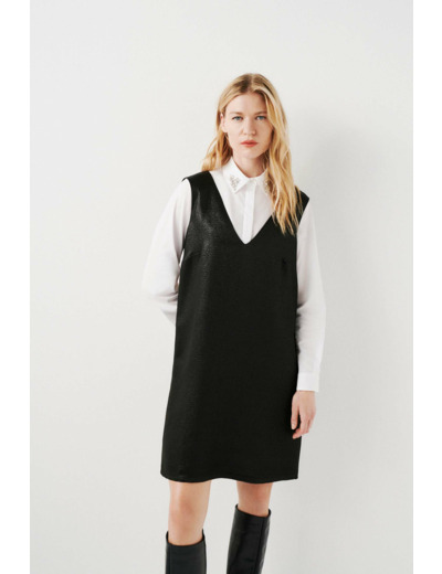 Conçue dans un mélange raffiné de viscose, polyester et fils métallisés, cette robe courte et droite épouse parfaitement la silhouette. Son col V et son absence de manches renforcent son style épuré, tandis que la fermeture zippée invisible au dos assure un maintien impeccable. La doublure en viscose garantit un confort optimal tout au long de la journée.