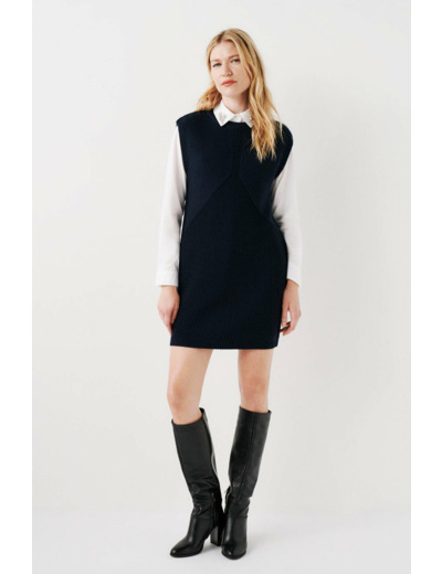 Conçue dans une laine mélangée douce et confortable, cette robe unie se distingue par ses empiècements texturés contrastants qui apportent une touche moderne et sophistiquée. Le col rond et l’absence de manches renforcent son allure épurée, idéale pour être portée en toute occasion, du bureau à une sortie en ville.