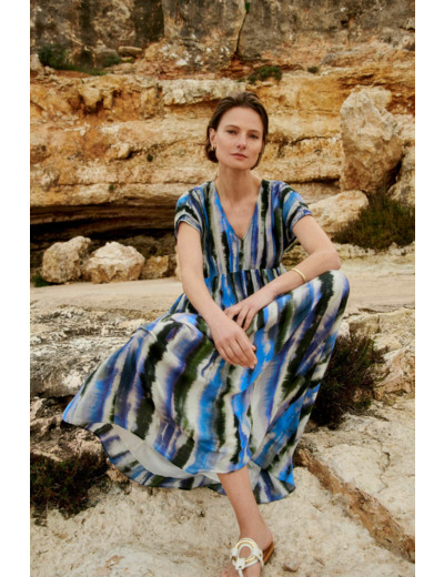 Confectionnée à 100 % en viscose, cette robe offre une douceur et une fluidité incomparables, pour un confort optimal tout au long de la journée. Son col en V et ses manches courtes apportent une touche de légèreté tandis que la poitrine marquée souligne subtilement la silhouette. Avec une longueur de 140 cm pour une taille 38, elle allonge la silhouette avec grâce.