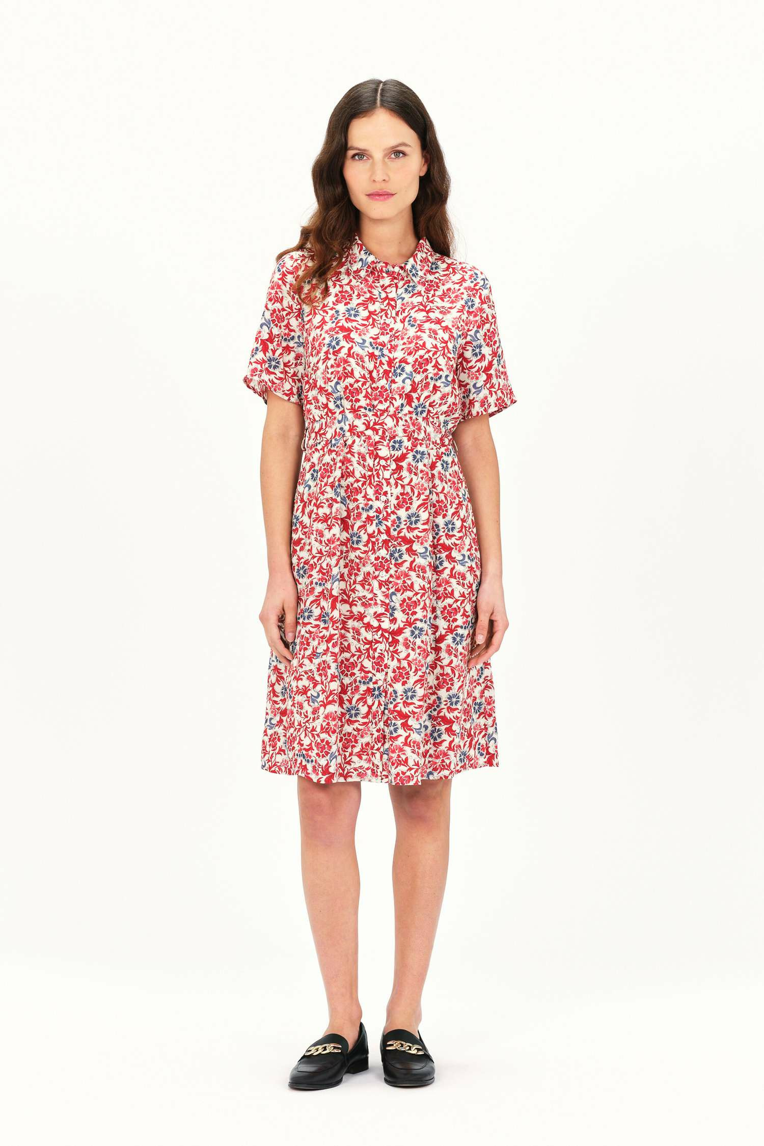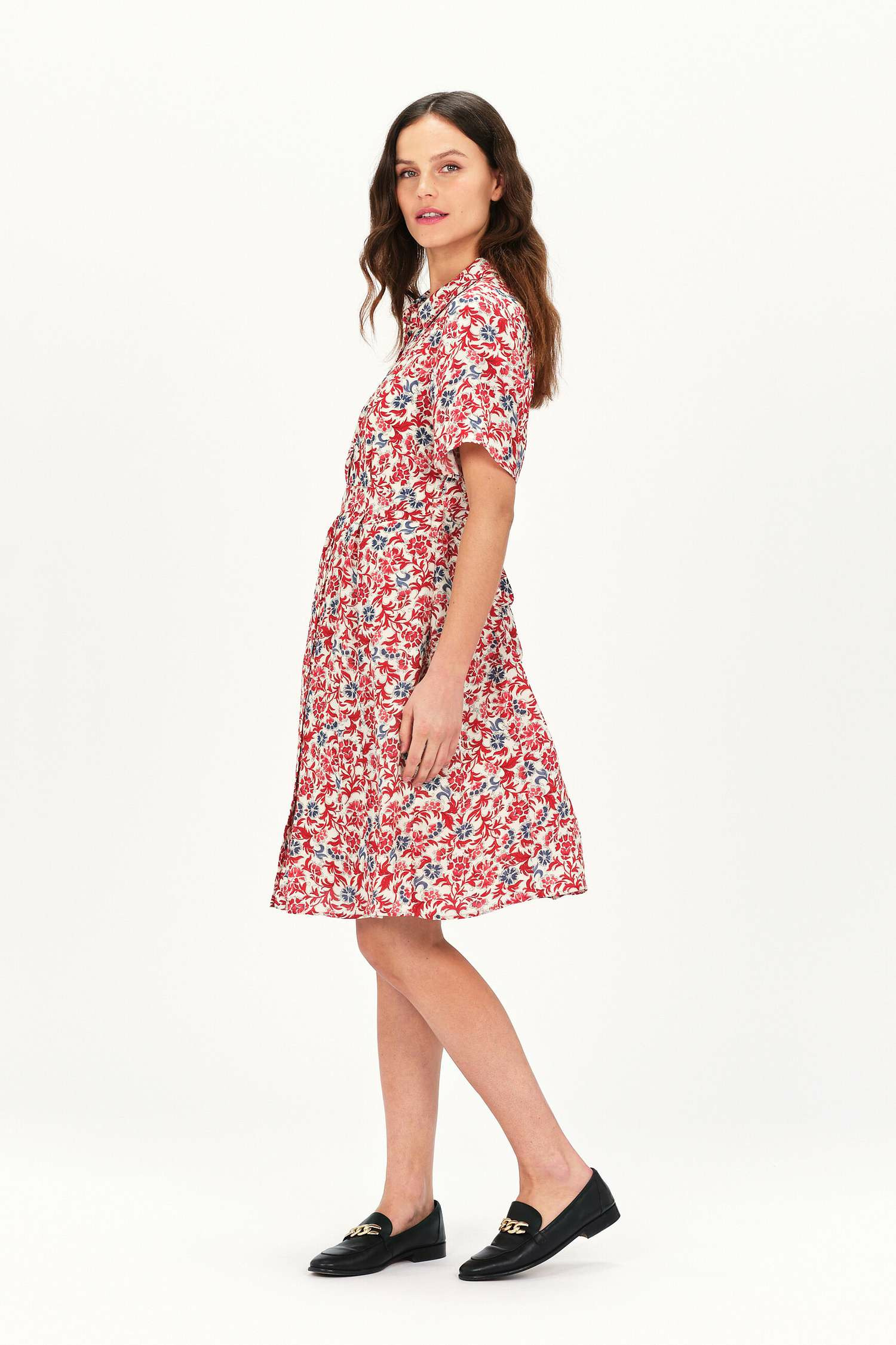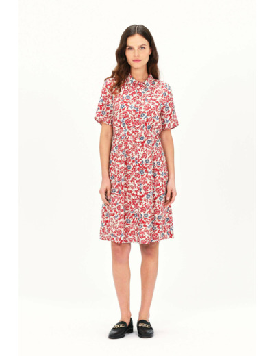 100 % viscose pour le tissu principal et la doublure, lavage à 30°C avec action réduite. Longueur de 98,5 cm pour une taille 38. Fermeture boutonnée au niveau de la poitrine, col chemise, manches courtes, taille ceinturée.