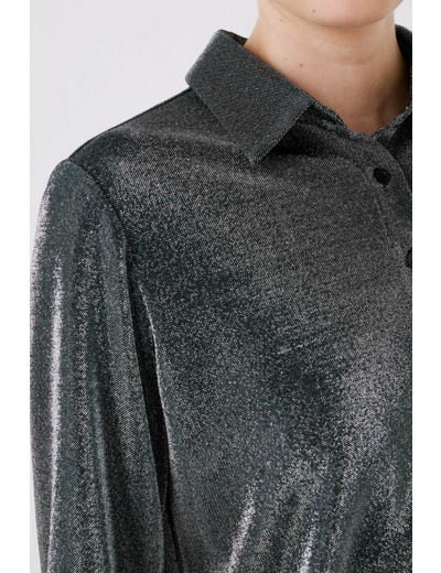 Confectionné dans un mélange de polyamide et de fils métallisés, ce t-shirt offre une texture unique et un éclat subtil qui capte la lumière. Son col chemise et ses manches longues rappellent les codes intemporels de la chemise, tandis que la fermeture par boutonnière sur patte apporte une finition soignée. Avec une longueur de 58 cm en taille S, il s’adapte parfaitement à toutes les silhouettes.