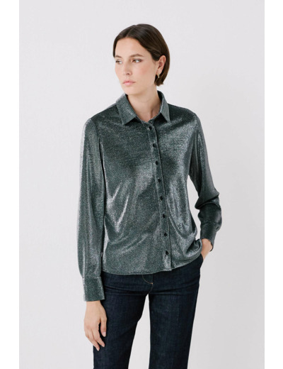 Tissu principal composé à 80 % de polyamide et 20 % de fil métallisé. Longueur 58 cm pour une taille S. Col chemise, manches longues, fermeture par boutonnière sur patte. Lavage recommandé à 30°C avec action réduite pour préserver la qualité des fibres.