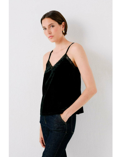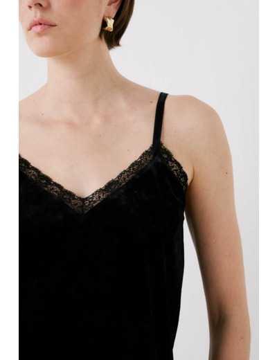 Tissu principal : 100 % polyester. Col V bordé de dentelle, fines bretelles, dos carré. Longueur 57 cm en taille S. Lavage conseillé à 30°C avec action réduite pour préserver la qualité du tissu.