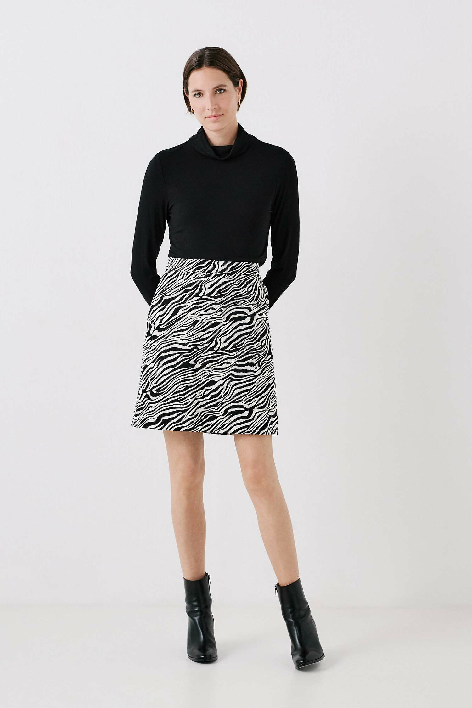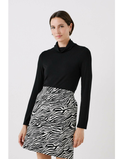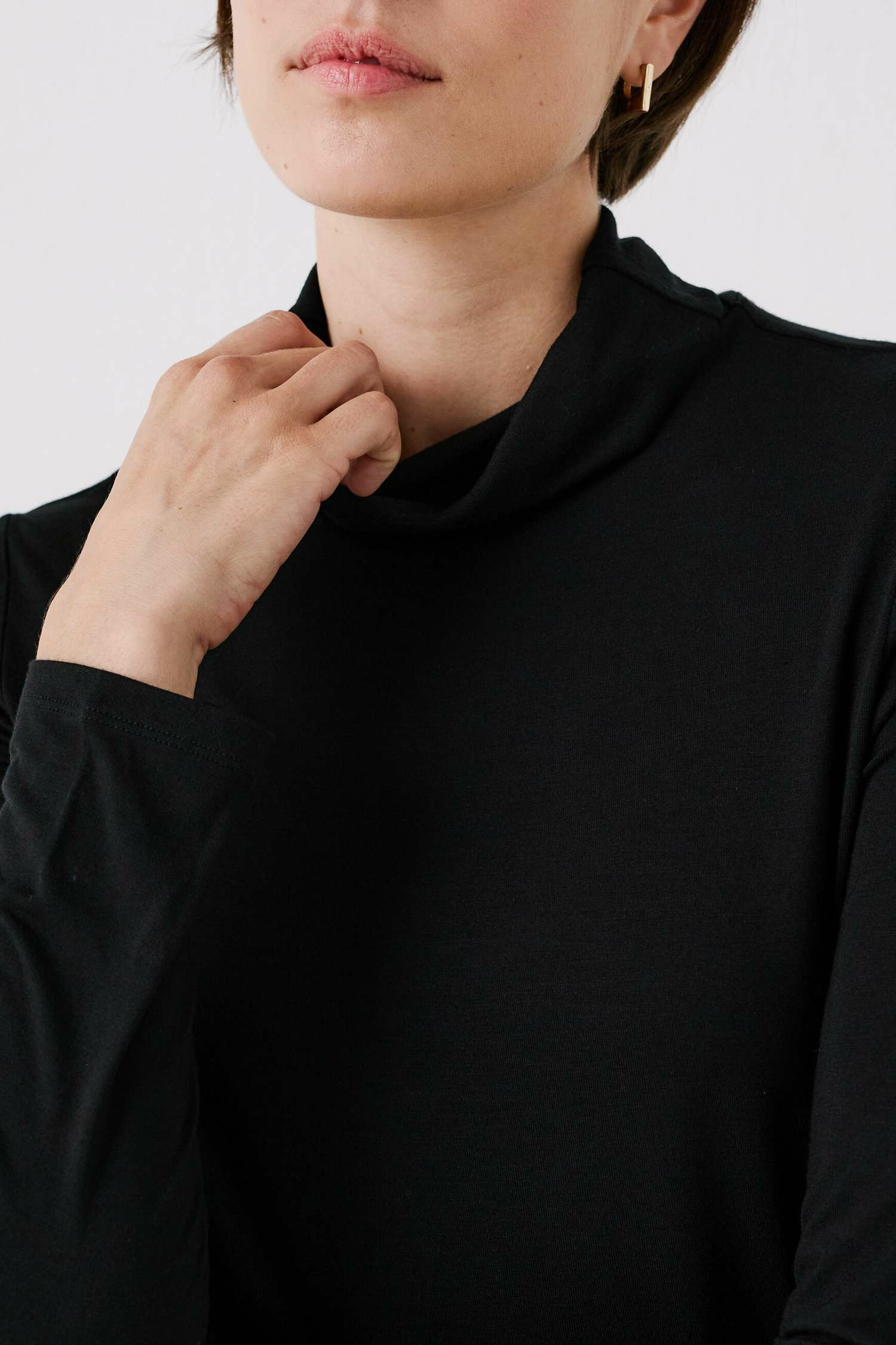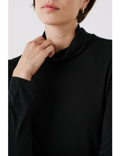 Confectionné dans un mélange de viscose doux et légèrement extensible, ce t-shirt à col roulé et manches longues offre une sensation agréable sur la peau. Sa longueur de 60 cm pour une taille S garantit une silhouette harmonieuse, idéale pour être portée seule ou sous une veste. Sa texture fluide épouse délicatement le corps sans contraindre les mouvements.