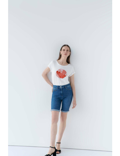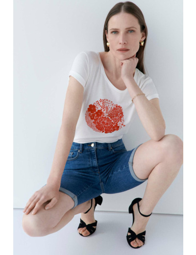 Le t-shirt tozan est composé à 50% de modal et 50% de coton, avec un col rond, des manches courtes et une longueur de 60 cm en taille S. Il se lave à 30 degrés pour préserver sa douceur et son imprimé.
