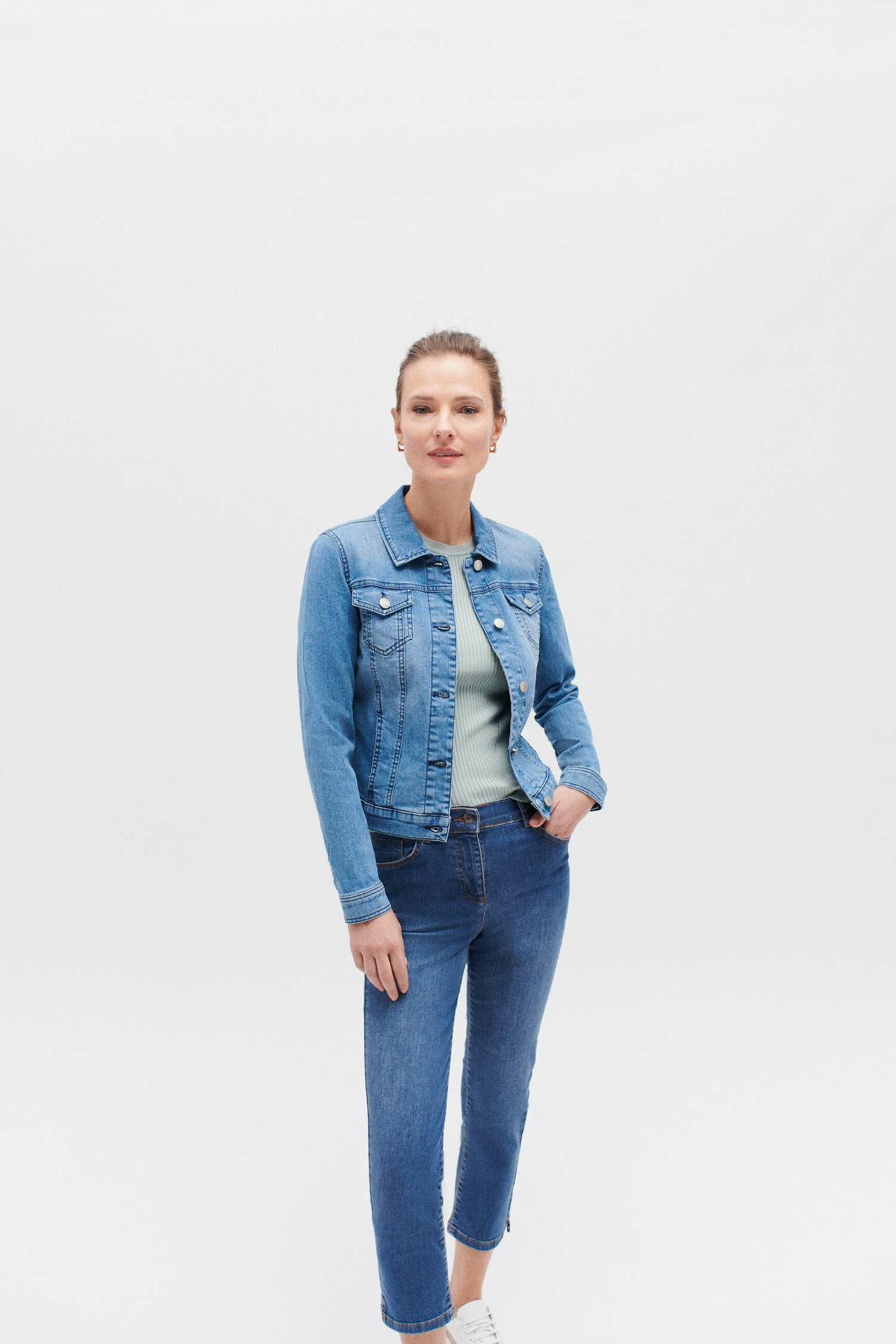 Veste col chemise à coupe droite, fermeture par boutons métalliques, poches poitrine à rabat boutonné, poches taille intégrées dans les découpes, jeu de découpes devant et dos, poignets fermés par un bouton. Longueur 50 cm en taille 38. Tissu principal : 98% coton, 2% élasthanne. Lavage à 30 degrés recommandé.