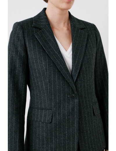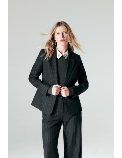 Affirmez votre élégance avec la veste Vambre3, un essentiel tailleur aux fines rayures qui sublime votre silhouette. Son design structuré incarne le raffinement professionnel sans compromis sur le confort.