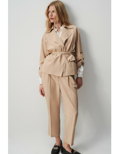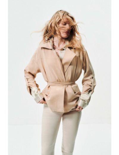 Tissu principal : 90% lyocell, 10% lin. Coupe droite, col tailleur, manches longues. Poches à rabat avec bouton métallisé. Fermeture par ceinture à nouer. Longueur 60 cm (taille 38). Lavage à 30°C, cycle délicat recommandé.
