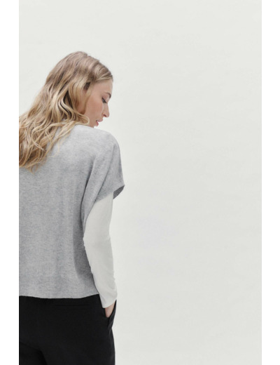 Réponse : Le gilet Lexie présente une coupe oversize à manches courtes avec une forme en T et une encolure en V.
