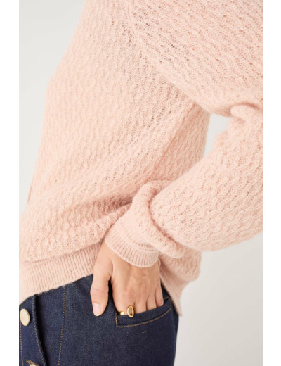 Réponse : Il est tricoté en mélange d’alpaga, laine RWS, polyamide, polyester et fil métallisé, avec un accessoire en nacre.