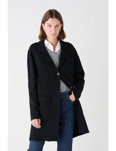 Tissu principal : coton 60%, polyamide 30%, laine 10%. Coupe droite mi-longue, col tailleur, manches longues, longueur 88 cm pour une taille S. Fermeture boutonnée. Entretien : lavage à la main uniquement, repassage à basse température (maximum 110°) sans vapeur, sèche-linge interdit.