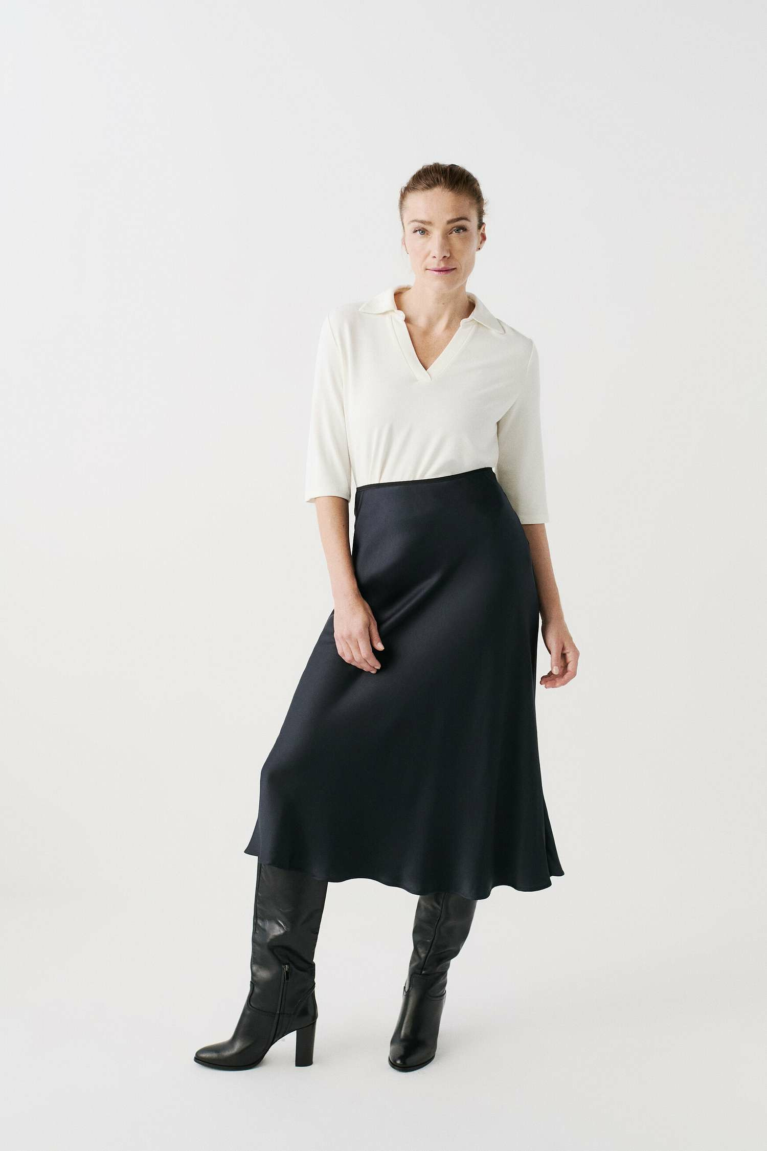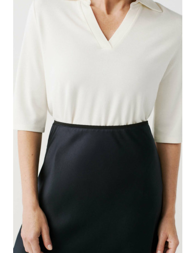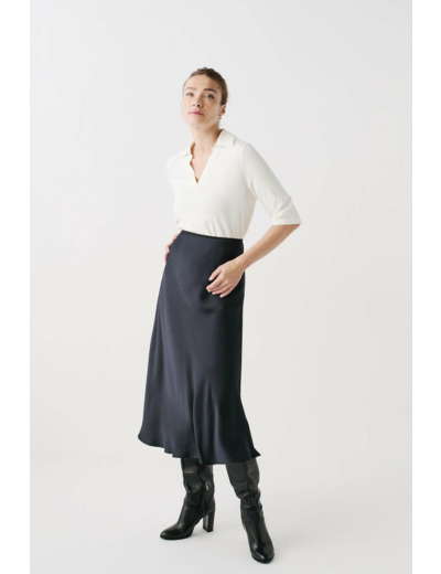 Jupe mi-longue à coupe fluide et évasée, longueur 82 cm pour une taille 38. Taille élastiquée pour un ajustement confortable. Composition : 59% polyester, 41% viscose. Lavage conseillé à 30°C avec action réduite pour préserver la qualité du tissu.