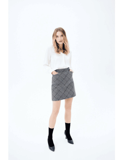 Affirmez votre style avec la jupe Jasmin, un classique revisité au motif Prince de Galles. Sa coupe trapèze courte sublime la silhouette avec élégance et modernité.