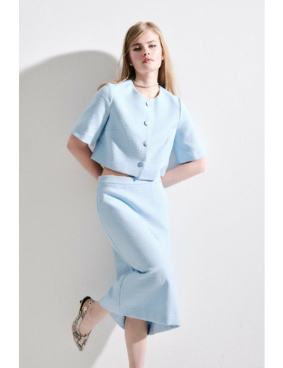 Réponse : Elle se porte parfaitement avec un chemisier Cmilly, une veste courte boutonnée et des escarpins, ou un pull fin ajusté et des bottines en cuir.