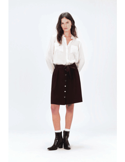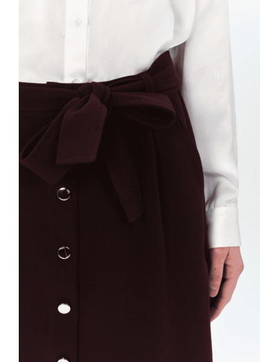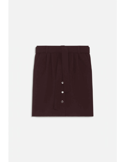 Tissu principal : polyester 77%, viscose 17%, élasthanne 6%. Doublure 100% acétate. Jupe courte, coupe droite, longueur 53 cm (taille 38). Taille haute avec ceinture à nouer et passants. Poches italiennes. Fermeture devant par boutonnière dorée. Lavage à 30°C, cycle délicat.